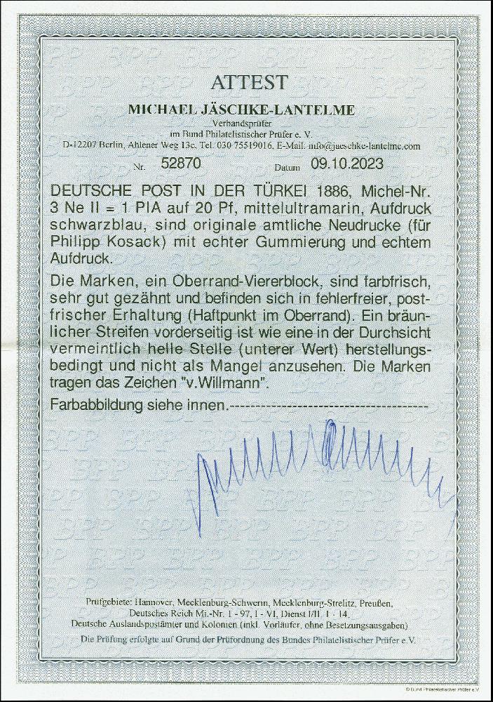 | Prüfer: | Jäschke-Lantelme, Michael (BPP (Bund Philatelistischer Prüfer)) |