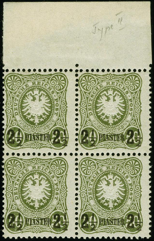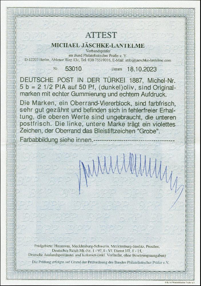 | Zusatzinformationen und Suchstichworte: | 383. Auktion Heinrich Köhler 14.–15. & 18.–23. März 2024 Los 6561 Deutsche Auslandspost Türkei 2½ Pia. auf 50 Pfg. oliv, Oberrand-4er-Block, farbfrisch und sehr gut gezähnt, ungebraucht, die unteren Werte postfrisch. Eine seltene Einheit in tadelloser Erhaltung. Ein Wert private Signatur und im Rand signiert Grobe, Fotoattest Jäschke-L. BPP (2023) Ausruf 500,00 EUR |