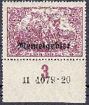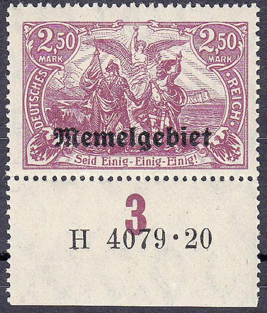 | Zusatzinformationen und Suchstichworte: | 145., 146. und 147. Teutoburger Münzauktion Auktionstermin: 28. Mai 2022 Los 4770 Memel 2,50 M Freimarke 1920, dunkelgraulila, bessere Farbe ,,c" als Unterrandstück mit Aufdruck-Hausauftragsnummer ,,H4079.29", postfrische Luxuserhaltung. Fotoattest Huylmans BPP >echt und einwandfrei<. Michel für die Aufdruck-HAN= 500,- Euro, das ist der Preis für die billigste Farbe der Marke. Die hier gezeigte ,,c"-Farbe notiert als Normalmarke in etwa das Dreifache der billigsten Farbe, sodass man für die Kombination ,,c-Farbe plus HAN" einen Katalogwert von etwa 1.500,-€. ansetzen kann. Preis Nachverkauf 180,00 EUR |