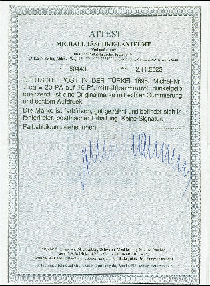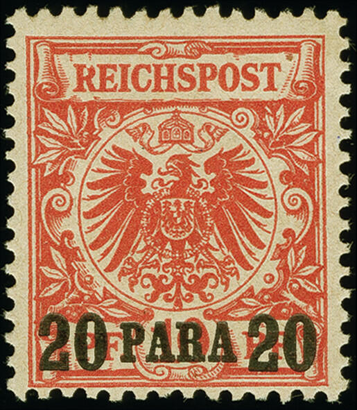 | Zusatzinformationen und Suchstichworte: | 383. Auktion Heinrich Köhler 14.–15. & 18.–23. März 2024 Los 7068 Deutsche Auslandspost Türkei 1889, 20 Para auf 10 Pfennig mittel(karmin)rot (dunkelgelb quarzend), postfrisch und in tadelloser Erhaltung, seltene Farbe, unsigniert mit Fotoattesten R. Steuer BPP (2011) und Jäschke-L. BPP (2022) Ausruf 500,00 EUR |