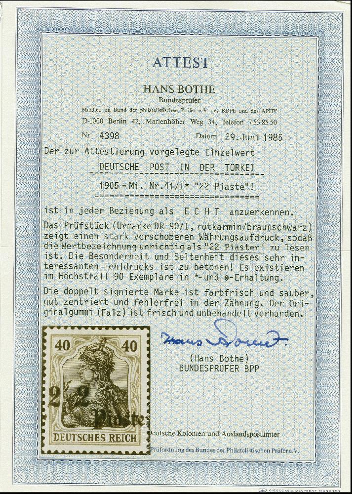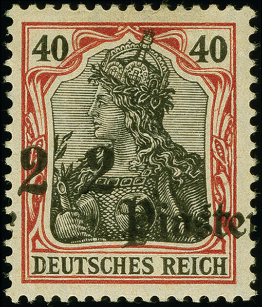 | Zusatzinformationen und Suchstichworte: | 383. Auktion Heinrich Köhler 14.–15. & 18.–23. März 2024 Los 7081 Deutsche Auslandspost Türkei 1905, 2 Piaster auf 40 Pfennig mit Aufdruckabart "seitlich stark verschobener Aufdruck '2 2 Piaster", ungebraucht, in tadelloser Erhaltung, signiert Kosack und Bothe BPP mit Fotoattest (1985) und Fotoattest Jäschke-L. BPP (2022) Ausruf 200,00 EUR |