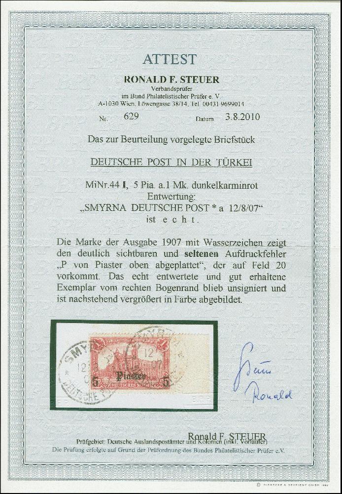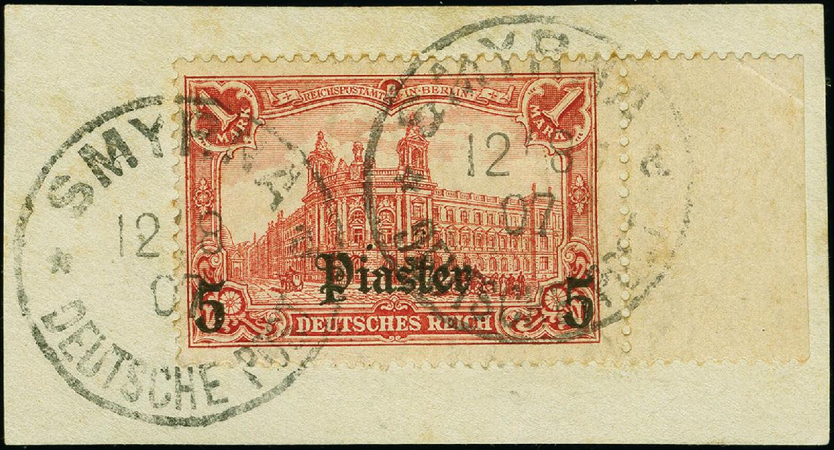 | Zusatzinformationen und Suchstichworte: | 383. Auktion Heinrich Köhler 14.–15. & 18.–23. März 2024 Los 7082 Deutsche Auslandspost Türkei 1905/13, 5 Piaster auf 1 Mark mit Aufdruckfehler "P von Piaster oben abgeplattet" (Feld 20), Randstück mit Stempel "SMYRNA DP *a 12.8.07" auf Briefstück, etwas Patina, sonst einwandfrei, Fotoattest R. Steuer BPP (2010) Ausruf 150,00 EUR |