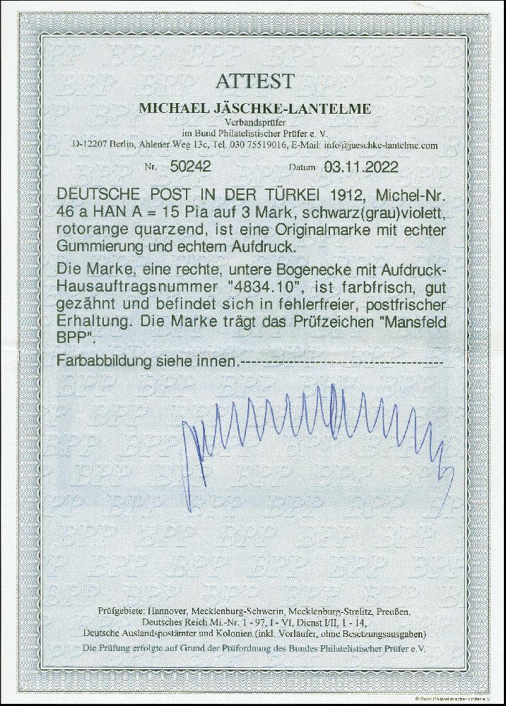 | Prüfgebiet: | Deutsche Auslandspostämter Türkei |