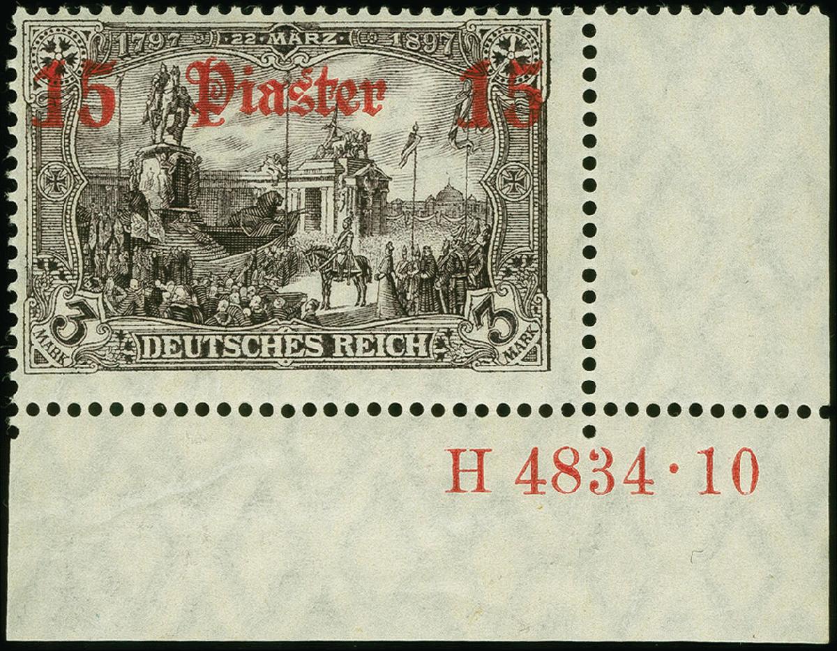 | Zusatzinformationen und Suchstichworte: | 383. Auktion Heinrich Köhler 14.–15. & 18.–23. März 2024 Los 7083 Deutsche Auslandspost Türkei 1905/13, 15 Piaster auf 3 Mark schwarz(grau)violett (rotorange quarzend) aus der rechten unteren Bogenecke mit HAN "H 4834.10", postfrisch, in tadelloser Erhaltung, signiert Mansfeld BPP und Fotoattest Jäschke-L. BPP (2022) Ausruf 250,00 EUR |
