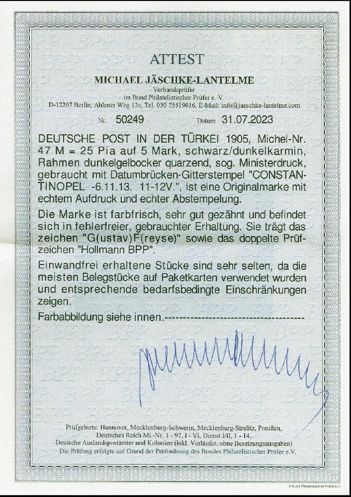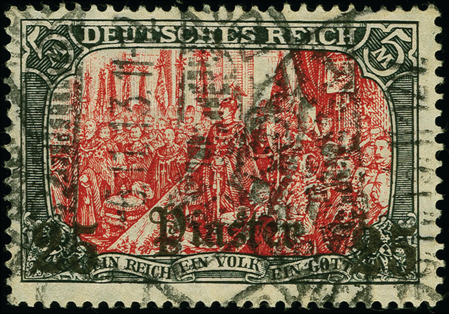 | Zusatzinformationen und Suchstichworte: | 383. Auktion Heinrich Köhler 14.–15. & 18.–23. März 2024 Los 708 Deutsche Auslandspost Türkei 1905, 25 Piaster auf 5 Mark schwarz/dunkelkarmin ohne Wasserzeichen, sogenannter "Ministerdruck" mit Stempel "CONSTANTINOPEL DP 6.11.13" in tadelloser Erhaltung. Eine in dieser Erhaltung sehr seltene Marke, mehrfach signiert und Fotoatteste Hollmann BPP (1997) und Jäschke-L. BPP (2023) Ausruf 1.000,00 EUR |