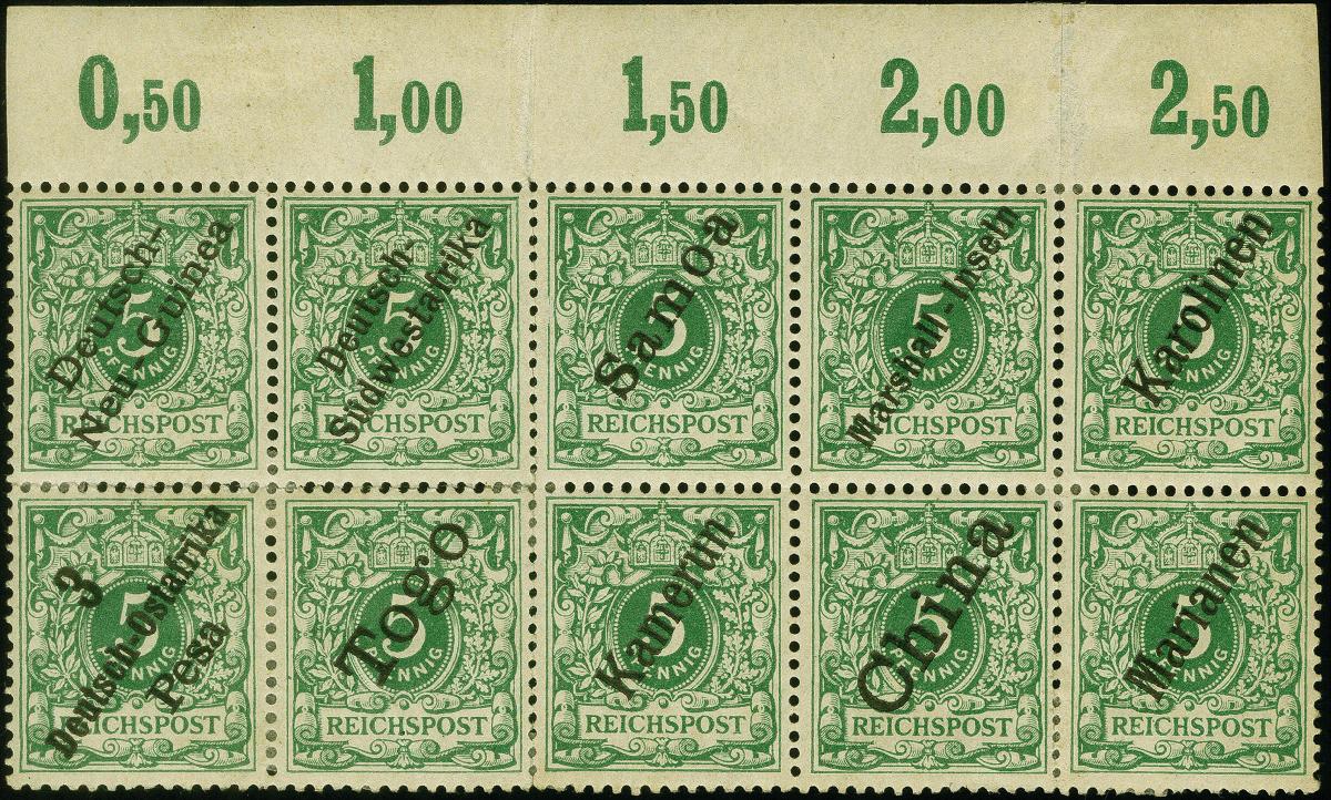 | Zusatzinformationen und Suchstichworte: | 383. Auktion Heinrich Köhler Auktionstermin 14.–15. & 18.–23. März 2024 Los 7092 Deutsche Kolonien Neuguinea 1899, 5 Pfennig Krone/Adler im waagerechten 10er-Block mit steilem Aufdruck der Landesnamen aller zehn verschiedenen Gebiete als amtlich angeordneter Vorlagedruck (Sonderauflage) aus der linken oberen Bogenecke (ohne linken Seitenrand), ungebraucht, ein Wert mit bildseitig kleiner Schürfstelle und ein Wert mit kleinem Zahnfehler. Die ehemals getrennte Einheit wurde mit Falzen zusammengefügt bzw. weitere Stellen sind angetrennt sowie kleine Fehler im Oberrand, trotz der Einschränkungen eine dekorative und außerordentlich seltene Einheit, bisher ist nur ein weiterer Block der 5 Pfennig-Wertstufe registriert, ausführliches Fotoattest Jäschke-L. BPP (2022) Ausruf 2.000,00 EUR |