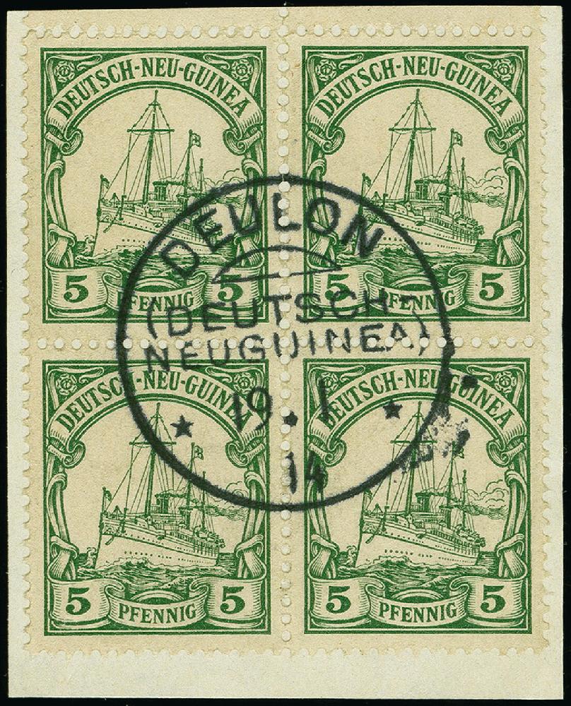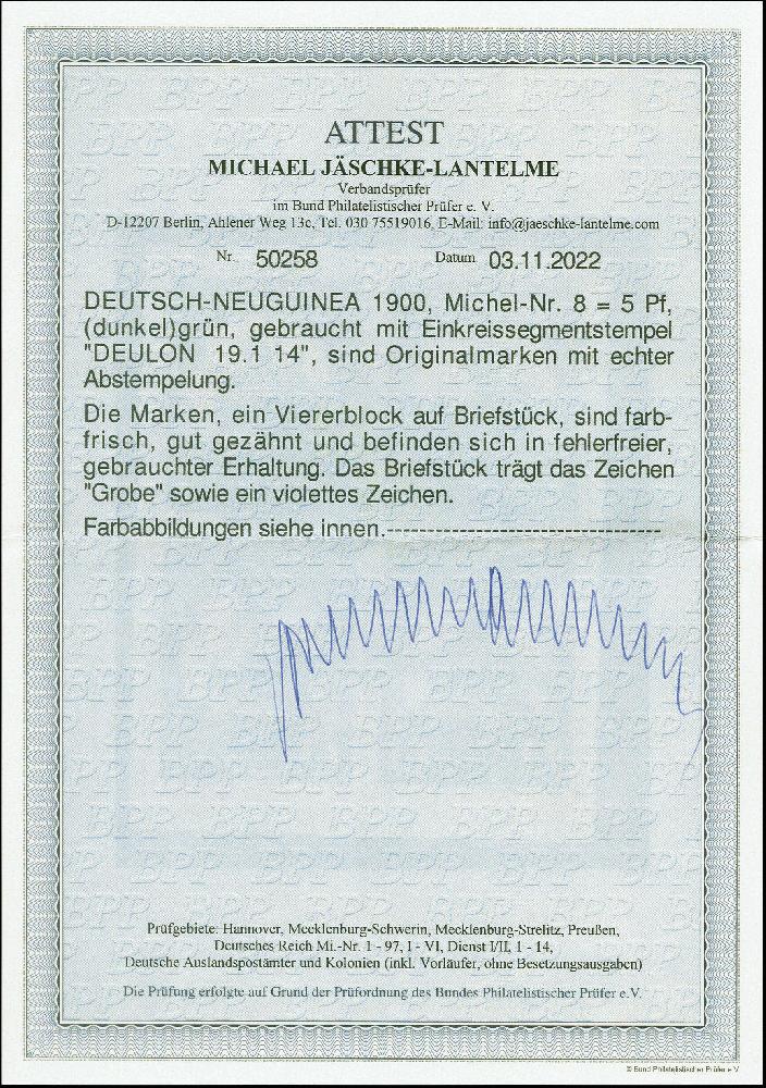 | Zusatzinformationen und Suchstichworte: | 383. Auktion Heinrich Köhler Auktionstermin 14.–15. & 18.–23. März 2024 Los 7094 Deutsche Kolonien Neuguinea "DEULON DNG 19.1.14" sehr klar auf Viererblock Kaiseryacht 5 Pfennig auf Briefstück in einwandfreier Erhaltung, signiert Grobe und Fotoattest Jäschke-L. BPP (2022) Ausruf 100,00 EUR |