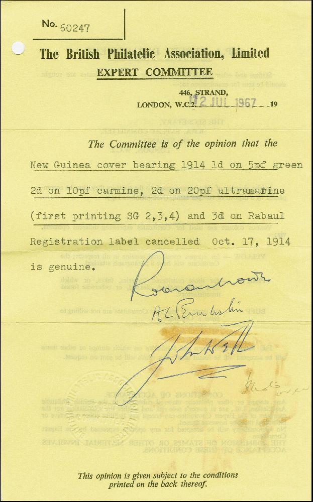 | Zusatzinformationen und Suchstichworte: | 383. Auktion Heinrich Köhler Auktionstermin 14.–15. & 18.–23. März 2024 Los 7331 Deutsche Kolonien Neuguinea Britische Besetzung 1 d. auf 5pfg. 2 d. auf 10 pfg. Und 2 d. auf 20 pfg. Alle entwertet durch L2 "RABAUL Oct 17 1914" zu Ortsbrief mit daneben gesetztem Eintragen Aufklebezettel 3 d. auf Rabaul (Fassung ein, Position 4) mit Zeilenstempel "RABAUL", Gibbs erwähnt jenes probaly die Etiketten wurden beigefügten und gestempelt nach dem Originaleinsatz, Pracht, Attest BPA (1967) Ausruf 120,00 EUR |