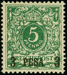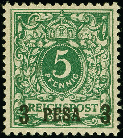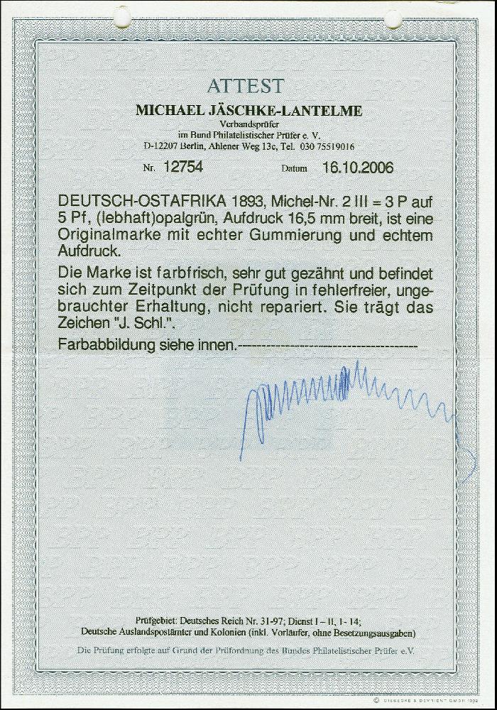 | Zusatzinformationen und Suchstichworte: | 383. Auktion Heinrich Köhler Auktionstermin 14.–15. & 18.–23. März 2024 Los 7102 Deutsche Kolonien Ostafrika 1893/96, 3 Pesa auf 5 Pfennig opalgrün mit Aufdruck "16,5 mm breit" (Feld 5 und 55 einer Teilauflage) ungebraucht, ein farbfrisches Exemplar dieser seltenen Aufdruck-Variante in tadelloser Erhaltung, signiert "J. Schl." und Fotoattest Jäschke-L. BPP (2006) Ausruf 200,00 EUR |