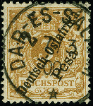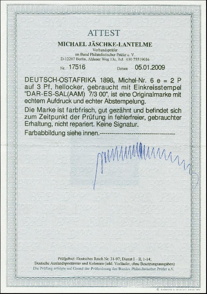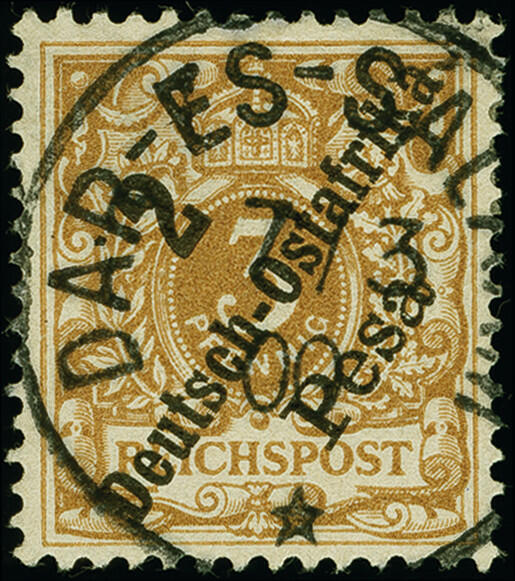 | Zusatzinformationen und Suchstichworte: | 383. Auktion Heinrich Köhler Auktionstermin 14.–15. & 18.–23. März 2024 Los 7105 Deutsche Kolonien Ostafrika 1896/99, 3 Pesa auf 3 Pfennig hellocker mit Stempel "DAR-ES-SALAAM 7.3.00" in tadelloser Erhaltung, Fotoattest Jäschke-L. BPP (2009) Ausruf 100,00 EUR |