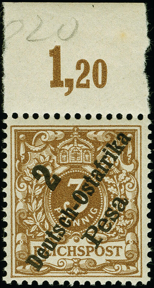 | Zusatzinformationen und Suchstichworte: | 383. Auktion Heinrich Köhler Auktionstermin 14.–15. & 18.–23. März 2024 Los 7106 Deutsche Kolonien Ostafrika 1896/99, 2 Pesa auf 3 Pfennig lebhaftorangebraun mit Oberrand, die farbfrische Marke ist postfrisch und in tadelloser Erhaltung, seltene Farbe, unsigniert mit Fotoattest Jäschke-L. BPP (2022) Ausruf 300,00 EUR |