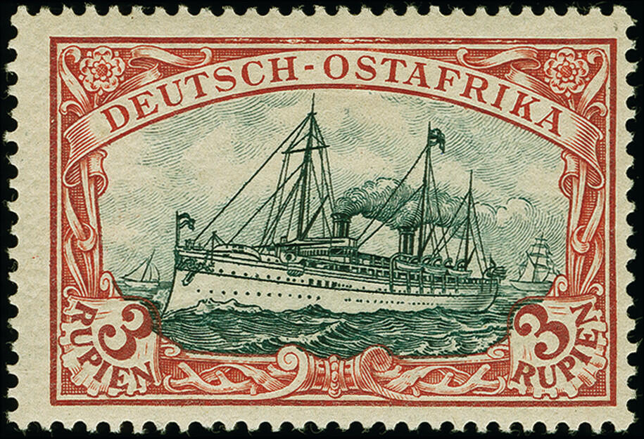 | Zusatzinformationen und Suchstichworte: | 383. Auktion Heinrich Köhler Auktionstermin 14.–15. & 18.–23. März 2024 Los 7111 Deutsche Kolonien Ostafrika 1901, Kaiseryacht 3 Rupien dunkelrot/grünschwarz mit Mittelstück der Type I, ungebraucht, farbfrisches Exemplar in tadelloser Erhaltung, unsigniert mit Fotoattest Jäschke-L. BPP (2022) Ausruf 300,00 EUR |