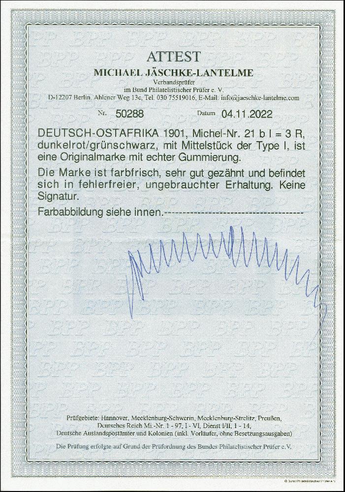 | Prüfer: | Jäschke-Lantelme, Michael (BPP (Bund Philatelistischer Prüfer)) |