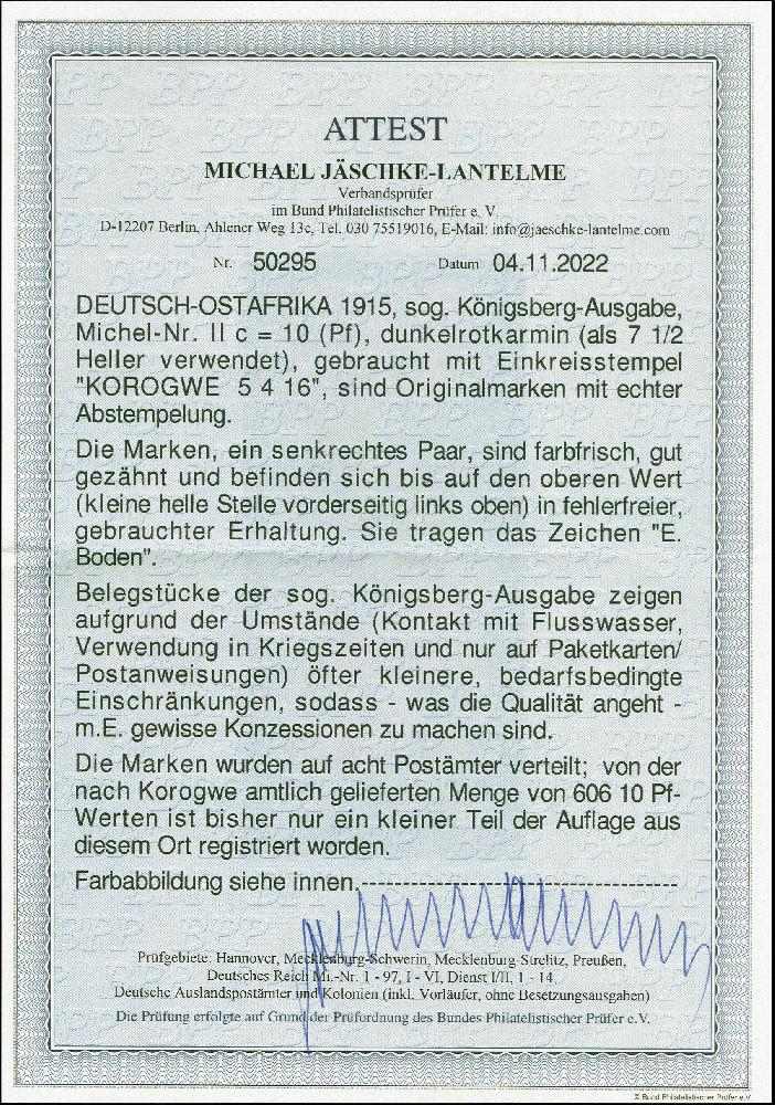| Zusatzinformationen und Suchstichworte: | 383. Auktion Heinrich Köhler Auktionstermin 14.–15. & 18.–23. März 2024 Los 7117 Deutsche Kolonien Ostafrika Königsberg-Ausgabe: 1915, Germania 10 Pfennig im senkrechten Paar je mit Stempel "KOROGWE DOA 5.4.16", obere Marke mit kleiner heller Stelle, sonst einwandfrei, selten, signiert E. Bogen und Fotoattest Jäschke-L. BPP (2022) Ausruf 200,00 EUR |