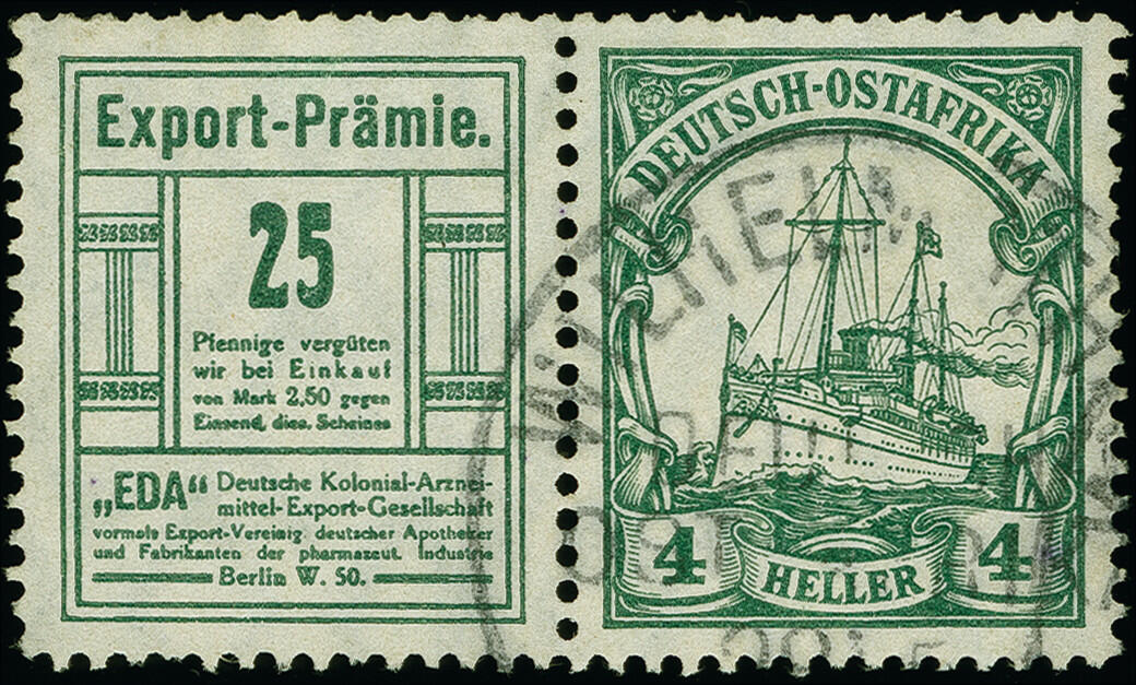 | Zusatzinformationen und Suchstichworte: | 383. Auktion Heinrich Köhler Auktionstermin 14.–15. & 18.–23. März 2024 Los 7118 Deutsche Kolonien Ostafrika Zusammendrucke: 1911, Reklame "Export-Prämie" + Kaiseryacht 4 Heller im waagerechten Zusammendruck, gestempelt, übliche herstellungsbedingte Zähnung und kleine Zahnfehler mit Zahnlochspalt rechts, sonst einwandfrei, Fotoattest Jäschke-L. BPP (2022) Ausruf 250,00 EUR |