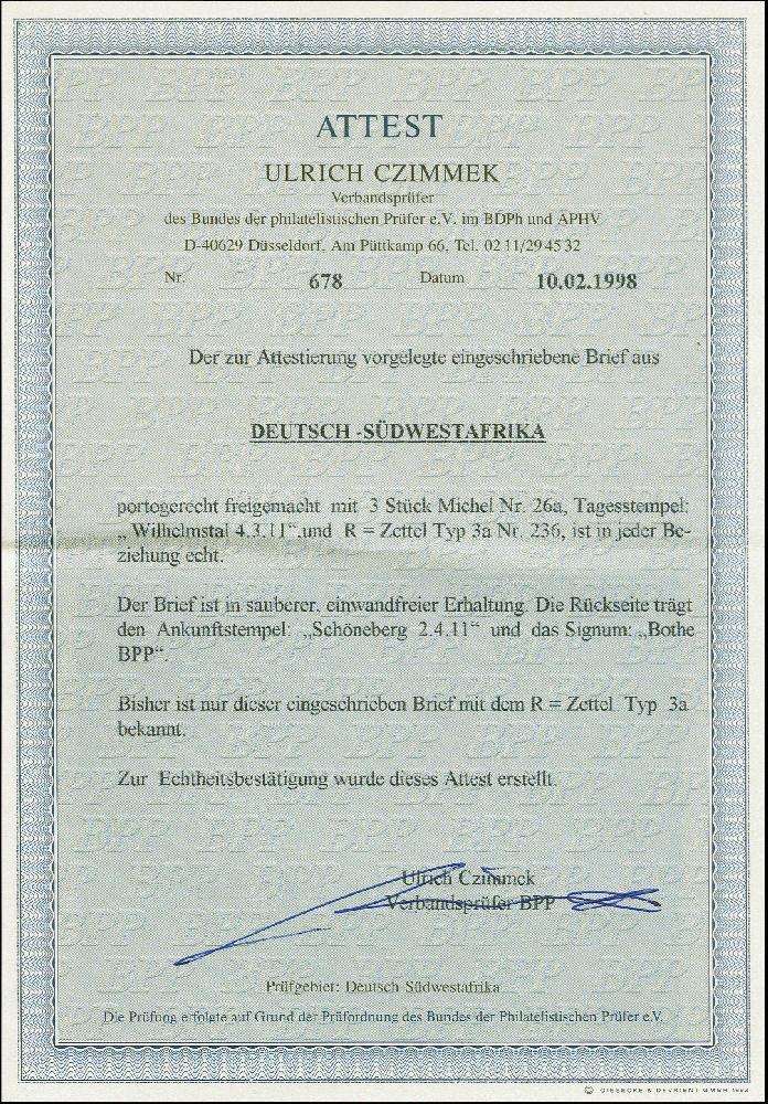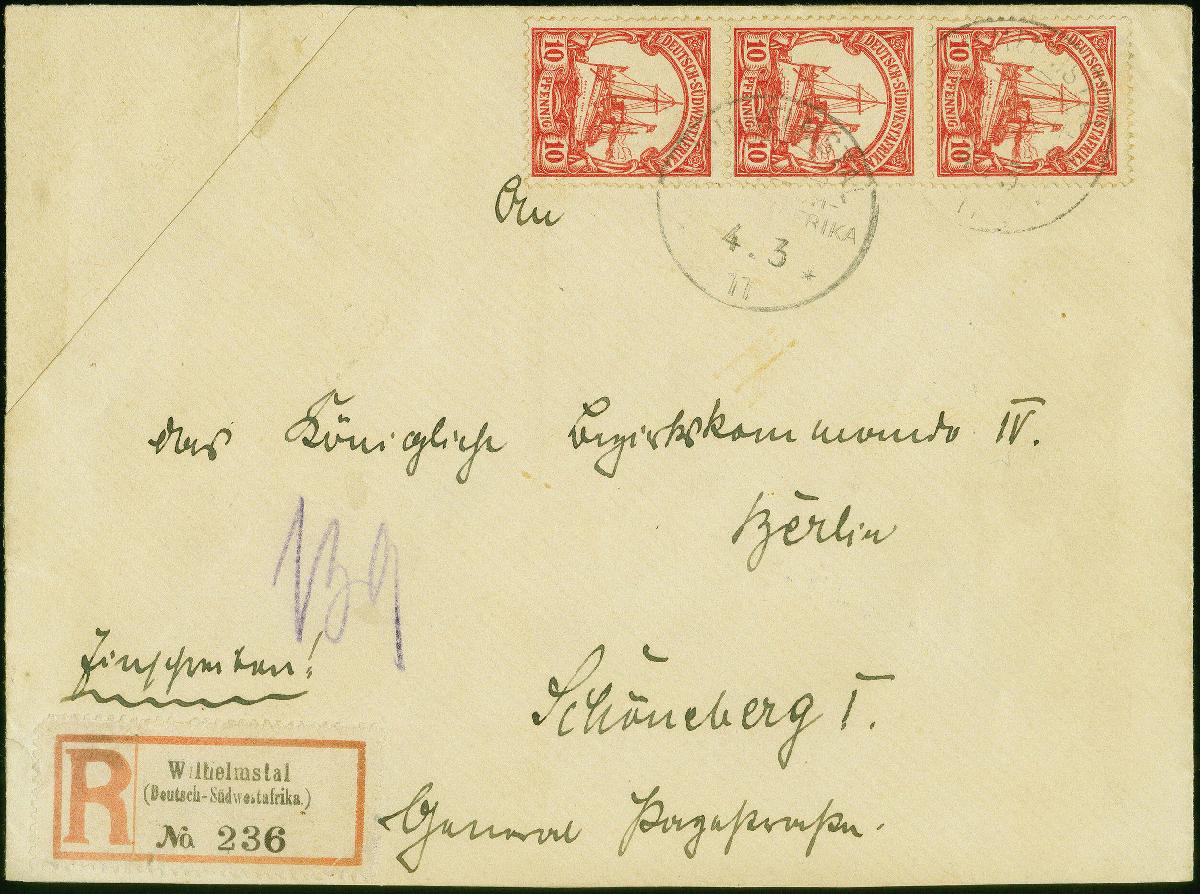 | Zusatzinformationen und Suchstichworte: | 383. Auktion Heinrich Köhler Auktionstermin 14.–15. & 18.–23. März 2024 Los 2513 Deutsche Kolonien Südwestafrika "WILHELMSTAL DSWA 4.3.11" zweimal recht klar auf senkrechten Dreierstreifen Kaiseryacht mit Wasserzeichen als tarifgerechte Mehrfachfrankatur auf R-Brief mit R-Zettel "Wilhelmstal (Deutsch-Südwestafrika)" (Einfeldt Nr. 3) nach Schöneberg bei Berlin mit Ankunftsstempel. Der Umschlag ist links oben großflächig repariert bzw. hinterlegt, sonst in guter Gesamterhaltung. Trotz der Einschränkungen ein interessanter R-Brief mit besserer R-Zetteltype, signiert Bothe BPP und Fotoattest Czimmek BPP (1998) Ausruf 150,00 EUR |