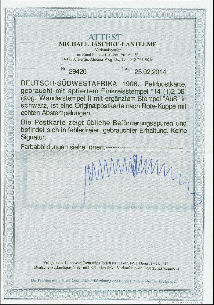 | Zusatzinformationen und Suchstichworte: | 383. Auktion Heinrich Köhler Auktionstermin 14.–15. & 18.–23. März 2024 Los 2744 Deutsche Kolonien Südwestafrika "AUS" schwarzer L1 klar mit Wanderstempel vom 14.(1)2.06 auf Feldpostkarte mit viel Text nach Deutschland in einwandfreier Erhaltung, Fotoattest Jäschke-L. BPP (2014) Ausruf 150,00 EUR |