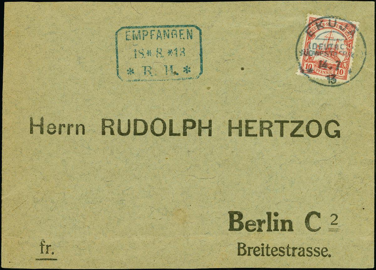 | Zusatzinformationen und Suchstichworte: | 383. Auktion Heinrich Köhler Auktionstermin 14.–15. & 18.–23. März 2024 Los 2748 Deutsche Kolonien Südwestafrika "EKUJA DSWA 14.7.13" sehr klar auf Kaiseryacht 10 Pfennig mit Wasserzeichen auf Vordruck-Umschlag nach Berlin mit vorderseitigem Eingangsstempel der Firma Rudolph Hertzog. Der Umschlag ist oben und unten minimal verkürzt und hat unten eine waagerechten Faltung, sonst in guter Gesamterhaltung. Ein dekorativer Brief mit dieser seltenen Entwertung, Fotoattest Meiners BPP (2008) Ausruf 400,00 EUR |