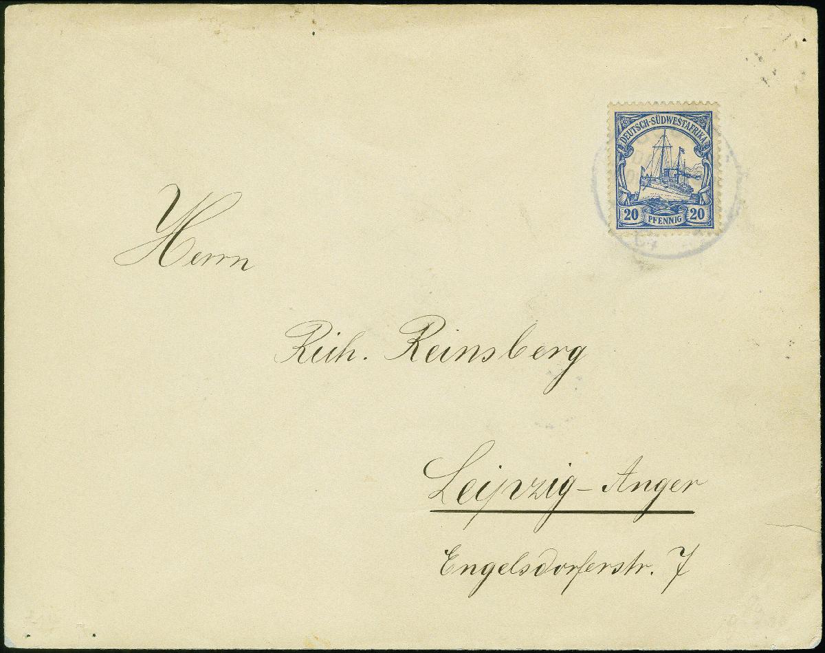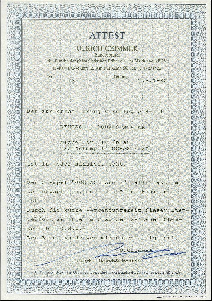 | Zusatzinformationen und Suchstichworte: | 383. Auktion Heinrich Köhler Auktionstermin 14.–15. & 18.–23. März 2024 Los 2753 Deutsche Kolonien Südwestafrika "GOCHAS DSWA..7.04" (ohne Segment), typischer Abschlag auf Kaiseryacht 20 Pfennig auf Brief nach Leipzig mit Ankunftsstempel vom 14.8. in guter Gesamterhaltung, seltener Stempel, Fotoattest Czimmek BPP (1986) Ausruf 200,00 EUR |