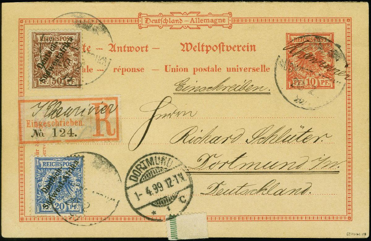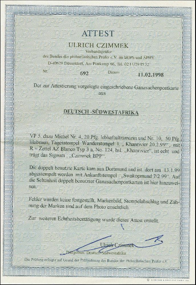 | Zusatzinformationen und Suchstichworte: | 383. Auktion Heinrich Köhler 14.–15. & 18.–23. März 2024 Los 2769 Deutsche Kolonien Südwestafrika "Khanriver" handschriftlich mit Wanderstempel vom 20.2.99 auf Antwort-Ganzsachenkarte Krone/Adler 10 Pfennig mit Zufrankatur Aufdruck-Ausgabe 1897/99 20 Pfennig und Ausgabe 1898 50 Pfennig als überfrankierte R-Karte mit Blanko-R-Zettel mit handschriftlichem Vermerk "Khanriver" ohne Text nach Dortmund mit Ankunftsstempel. Der Frageteil ist anhängend (angetrennt) gebraucht von "DORTMUND 13.1.99" mit Text nach Swakopmund mit Ankunftsstempel. In dieser Kombination ungewöhnliche Verwendung der Doppelkarte, signiert Czimmek BPP mit Fotoattest (1998) Ausruf 150,00 EUR |