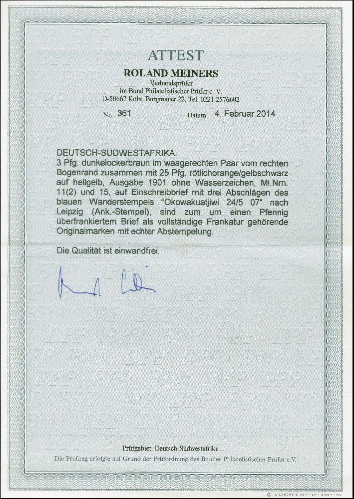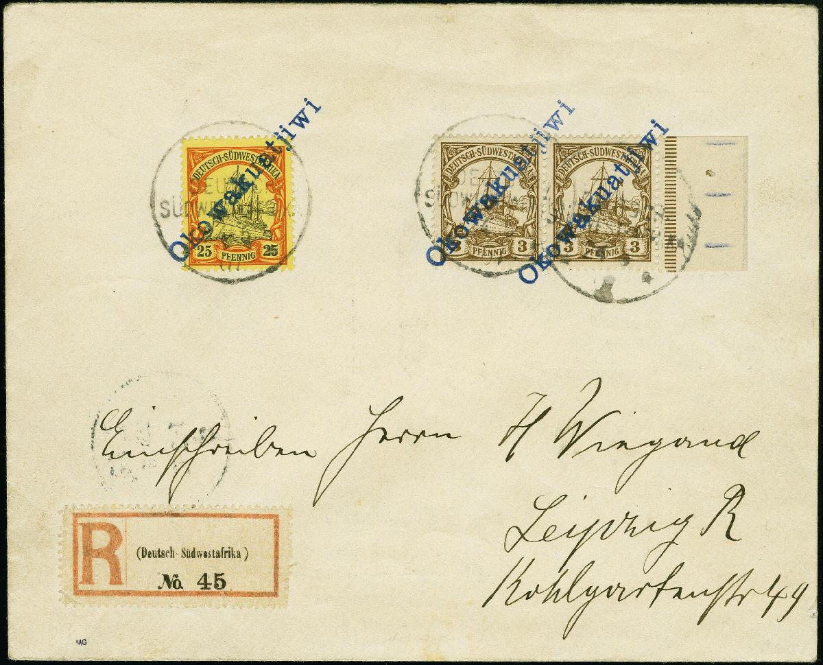 | Zusatzinformationen und Suchstichworte: | 383. Auktion Heinrich Köhler 14.–15. & 18.–23. März 2024 Los 2783 Deutsche Kolonien Südwestafrika "Okowakuatjiwi" blauer L1 dreimal klar mit Wanderstempel vom 24.5.07 auf waagerechtem Randpaar Kaiseryacht 3 Pfennig und Einzelwert 25 Pfennig auf um einen Pfennig überfrankiertem R-Brief mit Blanko-R-Zettel "(Deutsch-Südwestafrika) nach Leipzig mit Ankunftsstempel. Der Umschlag mit leichten Beförderungsspuren im Rand, sonst in einwandfreier Erhaltung, Fotoattest Meiners BPP (2014) Ausruf 150,00 EUR |