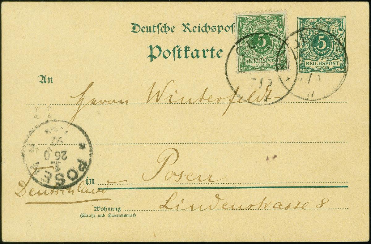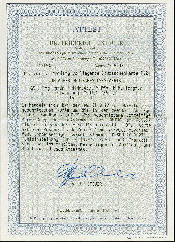 | Zusatzinformationen und Suchstichworte: | 383. Auktion Heinrich Köhler 14.–15. & 18.–23. März 2024 Los 2805 Deutsche Kolonien Südwestafrika "OUTJO 7.9. //" zweimal recht klar auf Ganzsachenkarten Krone/Adler 5 Pfennig mit Zufrankatur 5 Pfennig bläulichgrün sowie rückseitig viel Text mit Datierung "Otavifontein, den 31.8.97" nach Posen mit Ankunftsstempel in guter Erhaltung. Seltene Frühverwendung vor der Eröffnung des Postamtes, bisher sind nur wenige Belege bekannt, Fotoattest F. Steuer BPP (1993) Ausruf 300,00 EUR |