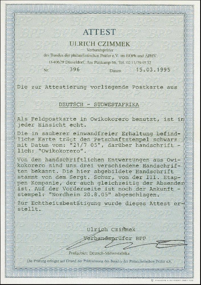 | Zusatzinformationen und Suchstichworte: | 383. Auktion Heinrich Köhler 14.–15. & 18.–23. März 2024 Los 2807 Deutsche Kolonien Südwestafrika "Owikokorero" handschriftlich mit Petschaftsstempel vom 21.7.05 auf Feldpostkarte (Knorr Werbekarte mit Abb. Soldaten beim Essen) mit viel Text und Absendervermerk "Serg. Schnur, III. Etappenkompagnie" nach Northeim mit vorderseitigem Ankunftsstempel in einwandfreier Erhaltung. Eine dekorative Karte mit dieser außergewöhnlich seltenen Entwertung, Fotoattest Czimmek BPP (1995) Ausruf 500,00 EUR |