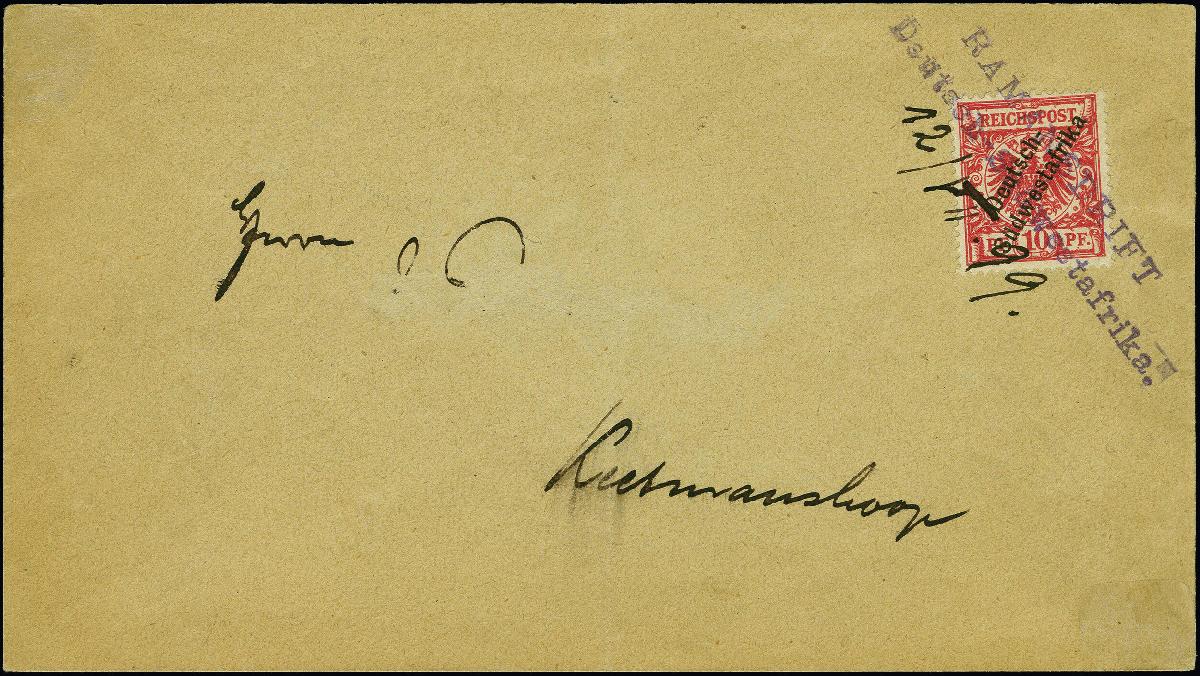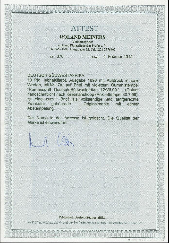 | Zusatzinformationen und Suchstichworte: | 383. Auktion Heinrich Köhler 14.–15. & 18.–23. März 2024 Los 2812 Deutsche Kolonien Südwestafrika "ROMANSDRIFT Deutsch-Südwestafrika" violetter L2 mit handschriftlichem Datum vom 12.VII.99 als Entwerter auf Aufdruck-Ausgabe 1898 auf Briefkuvert nach Keetmanshoop mit Ankunftsstempel. Der Umschlag mit senkrechter Faltung und Empfängername entfernt, ansonsten in guter Gesamterhaltung, seltene Entwertung, Fotoattest Meiners BPP (2014) Ausruf 250,00 EUR |