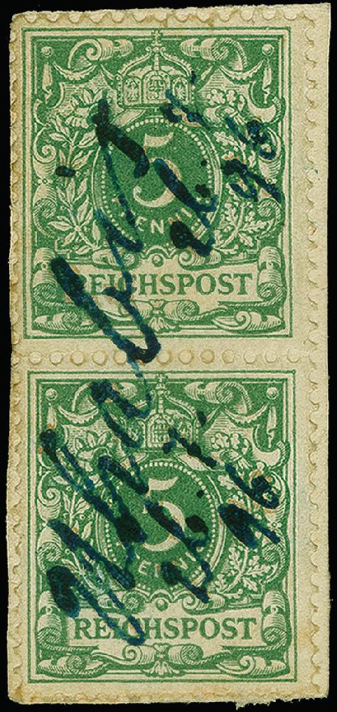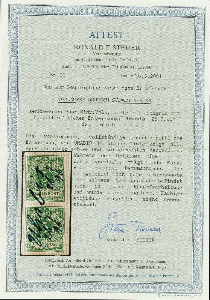 | Zusatzinformationen und Suchstichworte: | 383. Auktion Heinrich Köhler 14.–15. & 18.–23. März 2024 Los 2814 Deutsche Kolonien Südwestafrika "Uhabis 26.7.96" handschriftlich auf senkrechtem Paar Krone/Adler 5 Pfennig opalgrün auf Briefstück in einwandfreier Erhaltung, sehr seltene Entwertung, Fotoattest R. Steuer BPP (2001) Ausruf 300,00 EUR |