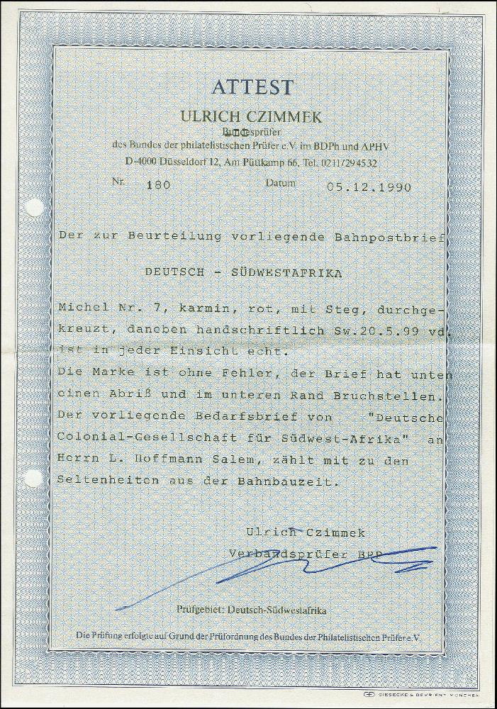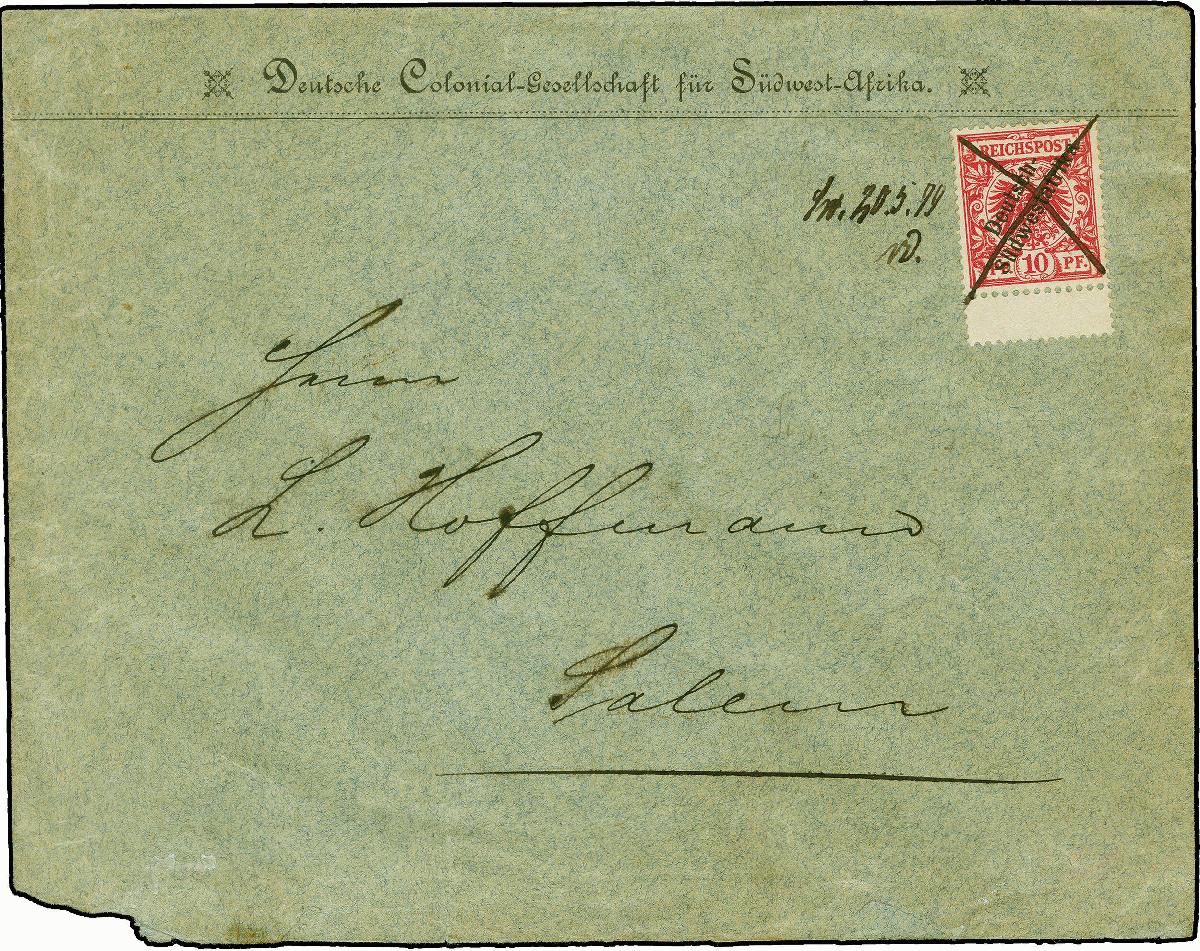 | Zusatzinformationen und Suchstichworte: | 383. Auktion Heinrich Köhler 14.–15. & 18.–23. März 2024 Los 2827 Deutsche Kolonien Südwestafrika "Sw. 20.5.99 vD." handschriftlicher Vemerk auf Vordruckbrief "Deutsche Colonial-Gesellschaft für Südwest-Afrika" mit Aufdruck-Ausgabe 1898 10 Pfennig mit Stegansatz unten und Federkreuz-Entwertung nach Salem. Der Umschlag hat Beförderungsspuren und unten links eine kleine Fehlstelle, sonst in guter Gesamterhaltung, seltene handschriftliche Stations-Entwertung, Fotoattest Czemmik BPP (1990) Ausruf 200,00 EUR |