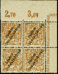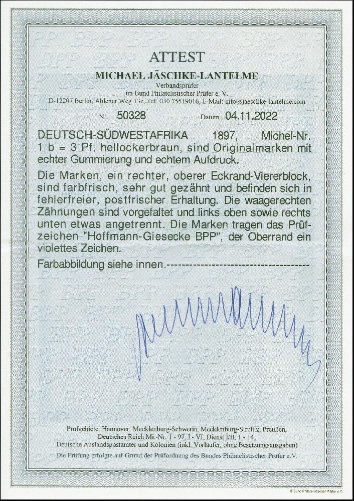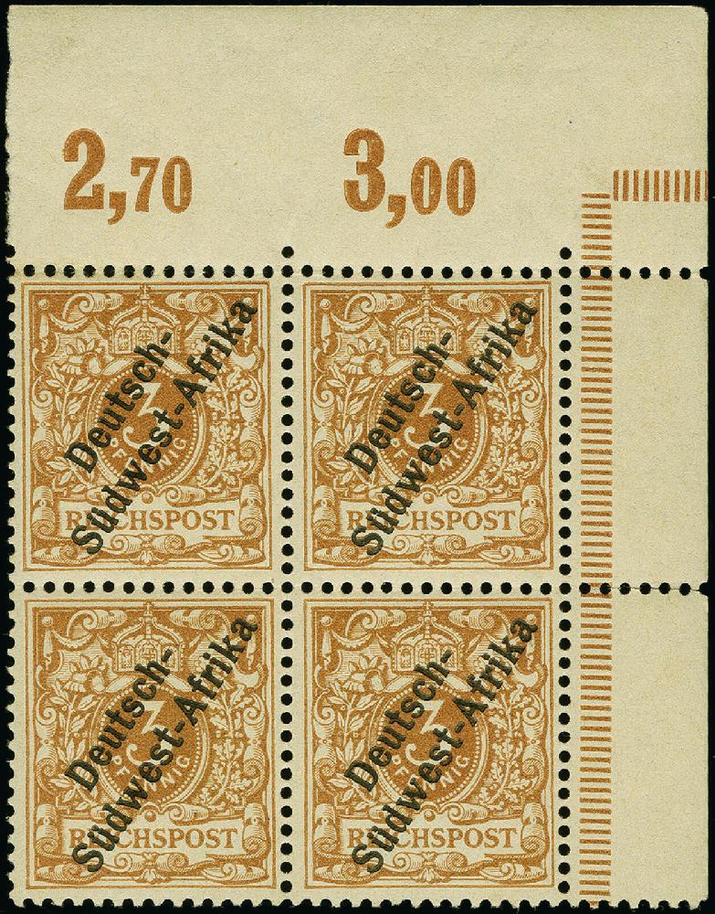 | Zusatzinformationen und Suchstichworte: | 383. Auktion Heinrich Köhler 14.–15. & 18.–23. März 2024 Los 7129 Deutsche Kolonien Südwestafrika 1897, 3 Pfennig hellockerbaun im Viererblock aus der rechten oberen Bogenecke, postfrisch, waagerecht vorgefaltet und etwas angetrennt, die Marken sind in tadelloser Erhaltung, signiert Hoffmann-Giesecke BPP und Fotoattest Jäschke-L. BPP (2022) Ausruf 150,00 EUR |
