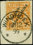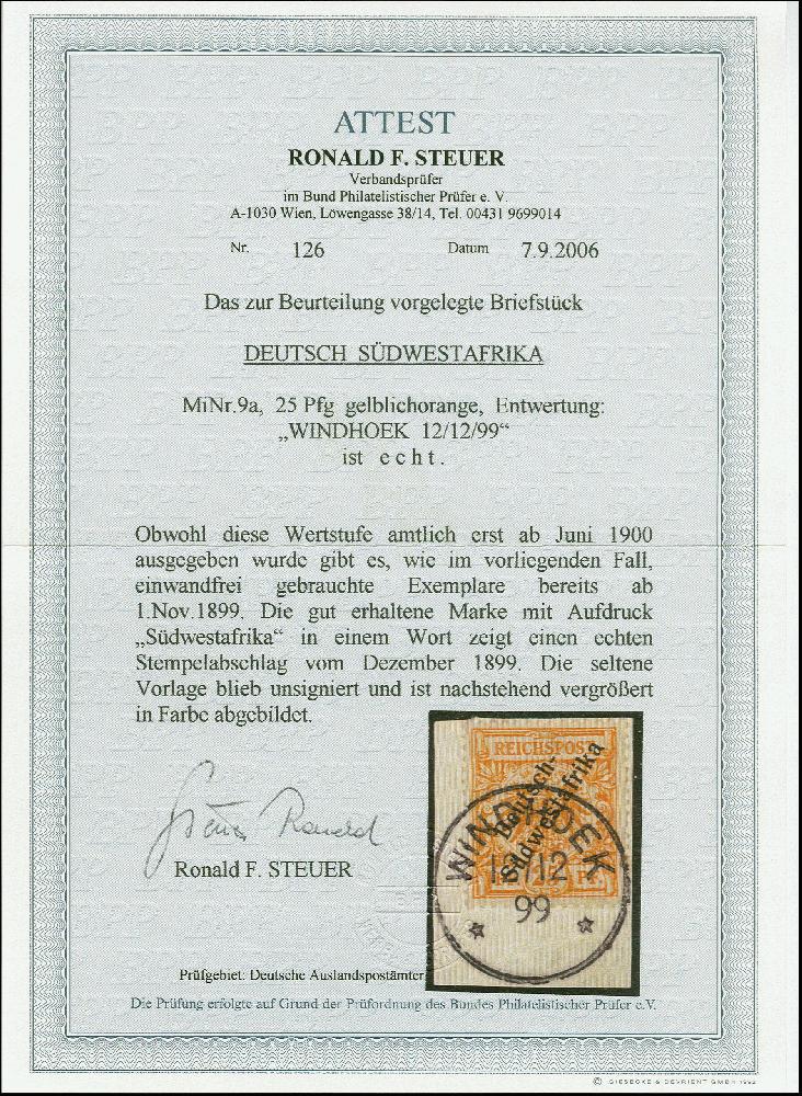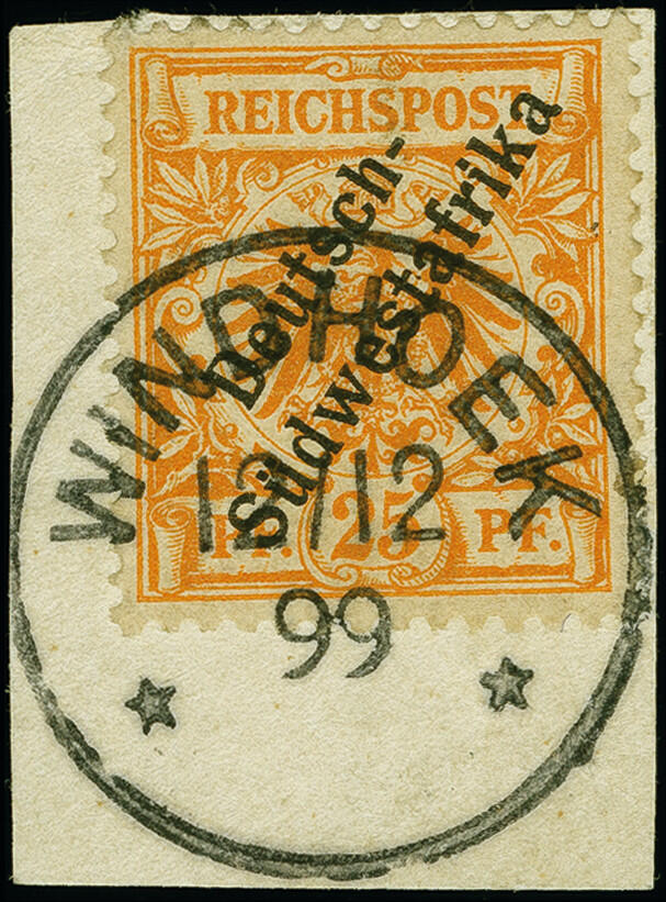| Zusatzinformationen und Suchstichworte: | 383. Auktion Heinrich Köhler 14.–15. & 18.–23. März 2024 Los 7131 Deutsche Kolonien Südwestafrika 1898/99, 25 Pfennig gelblichorange mit Stempel "WINDHOEK 12.12.99" auf Briefstück in tadelloser Erhaltung, seltene frühe Verwendung, Fotoattest R. Steuer BPP (2006) Ausruf 150,00 EUR |