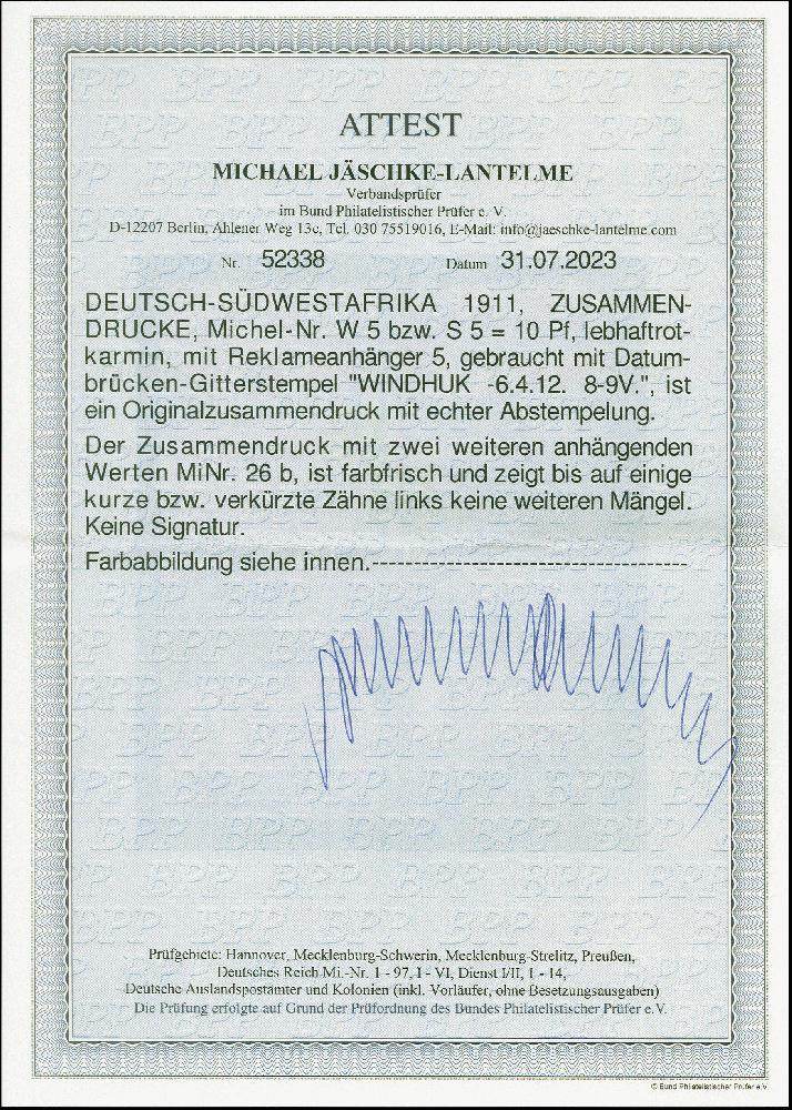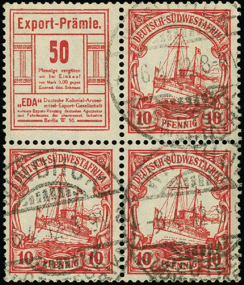 | Zusatzinformationen und Suchstichworte: | 383. Auktion Heinrich Köhler 14.–15. & 18.–23. März 2024 Los 7140 Deutsche Kolonien Südwestafrika 1911, Reklame "Export-Prämie" + 10 Pfennig im waagerechten Zusammendruck mit zwei weiteren Marken, gestempelt, links mit kurzen bzw. verkürzten Zähnen, sonst in guter Gesamterhaltung, selten, Fotoattest Jäschke-L. BPP (2022) Ausruf 300,00 EUR |