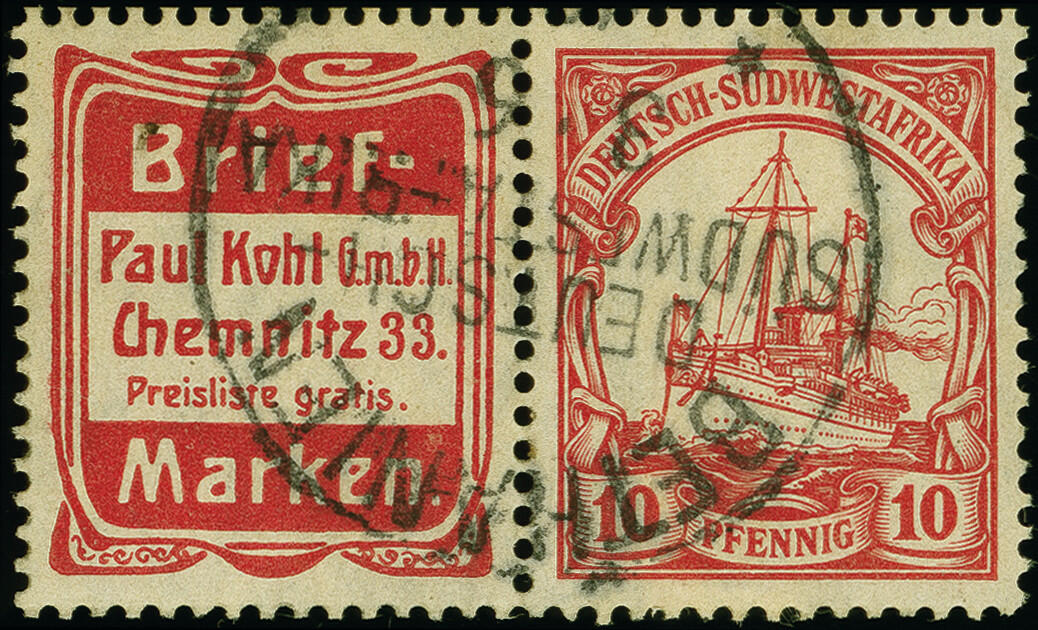 | Zusatzinformationen und Suchstichworte: | 383. Auktion Heinrich Köhler 14.–15. & 18.–23. März 2024 Los 7141 Deutsche Kolonien Südwestafrika 1911, Reklame "Briefmarken Paul Kohl" + 10 Pfennig im waagerechten Zusammendruck, sauber gestempelt, in einwandfreier Erhaltung, in dieser Erhaltung sehr selten, signiert Bothe BPP und Fotoattest Jäschke-L. BPP (2022) Ausruf 400,00 EUR |