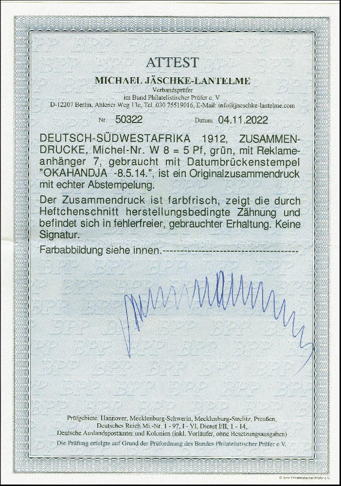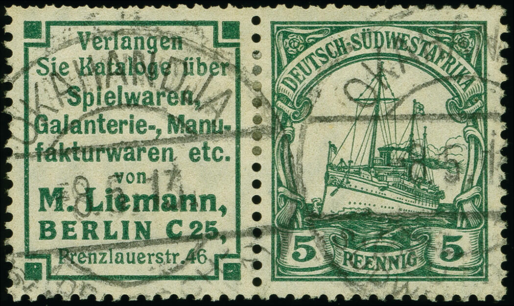 | Zusatzinformationen und Suchstichworte: | 383. Auktion Heinrich Köhler 14.–15. & 18.–23. März 2024 Los 7142 Deutsche Kolonien Südwestafrika 1911, Reklame "M.Liemann" + 5 Pfennig im waagerechten Zusammendruck, sauber gestempelt, oben mit Heftchenzähnung, sonst in einwandfreier Erhaltung, Fotoattest Jäschke-L. BPP (2022) Ausruf 300,00 EUR |