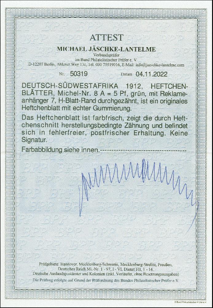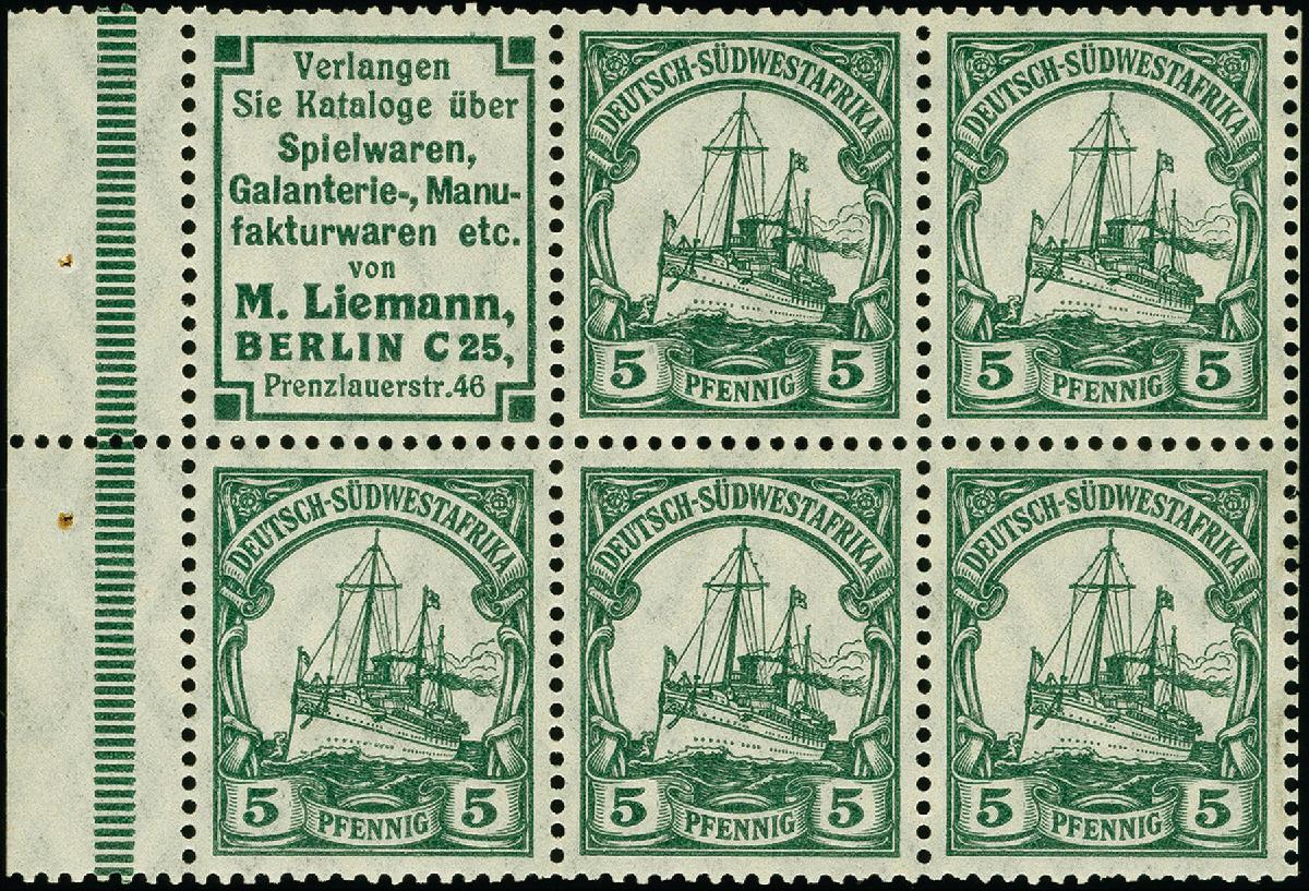 | Zusatzinformationen und Suchstichworte: | 383. Auktion Heinrich Köhler 14.–15. & 18.–23. März 2024 Los 7144 Deutsche Kolonien Südwestafrika 1911, Heftchenblatt mit Reklame "M. Liemann" + 5 Pfennig mit durchgezähntem Rand, postfrisch mit typischer Heftchenzähnung, sonst in einwandfreier Erhaltung, unsigniert mit Fotoattest Jäschke-L. BPP (2022) Ausruf 150,00 EUR |