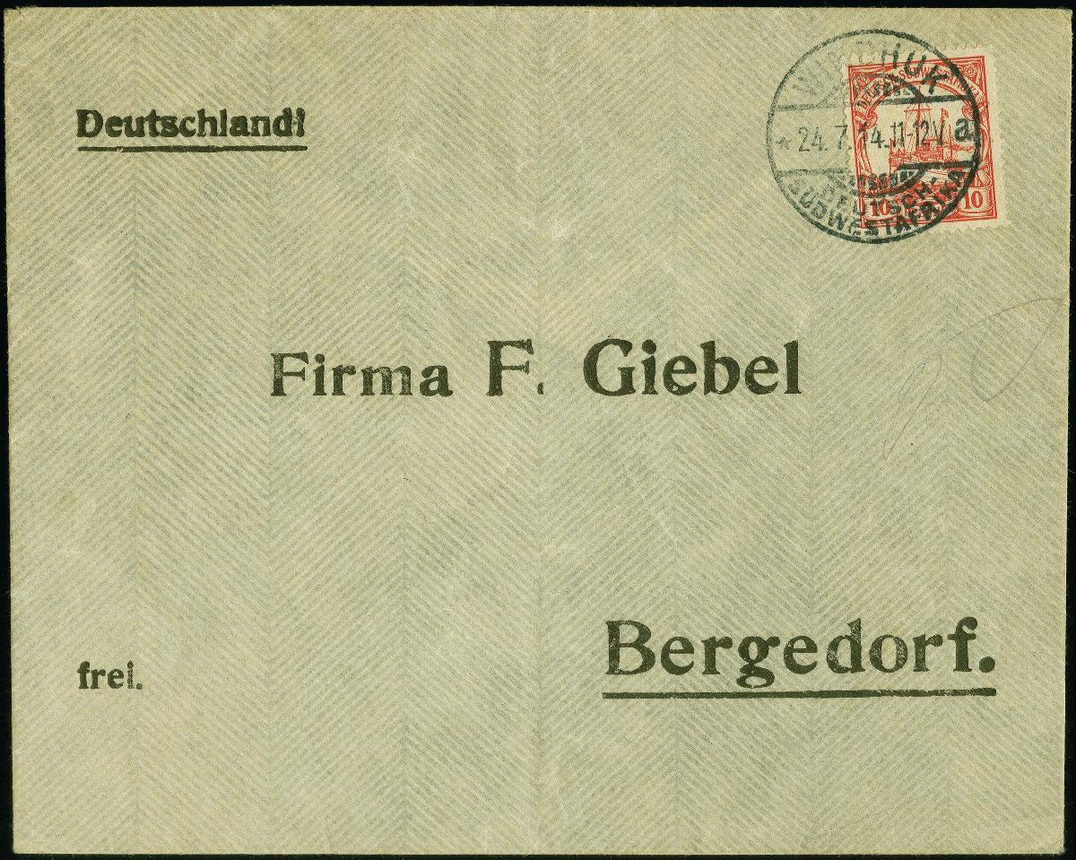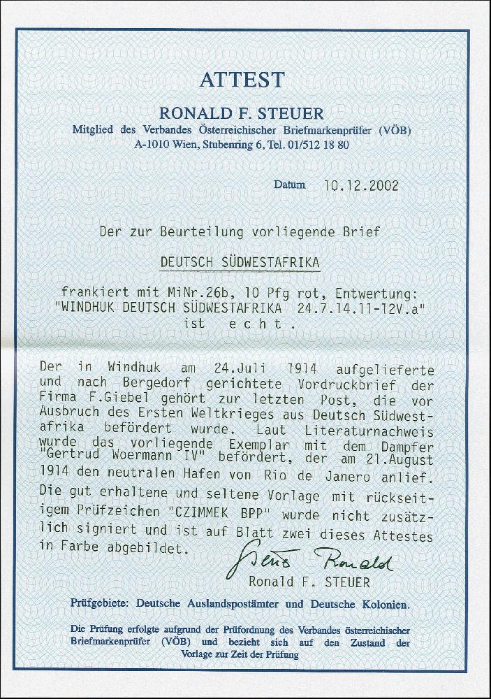 | Zusatzinformationen und Suchstichworte: | 383. Auktion Heinrich Köhler 14.–15. & 18.–23. März 2024 Los 7146 Deutsche Kolonien Südwestafrika 1914, Kaiseryacht 10 Pfennig mit Wasserzeichen, sauber mit Stempel "WINDHUK DSWA *a 24.7.14" auf Firmen-Vordruckbrief als letzter Postabgang befördert mit dem Dampfer "Getrud Woermann IV" nach Rio de Janeiro, von dort während des Krieges weiter befördert nach Deutschland, gute Erhaltung, signiert Czimmek BPP und Fotoattest R. Steuer VÖB (2002) Ausruf 80,00 EUR |