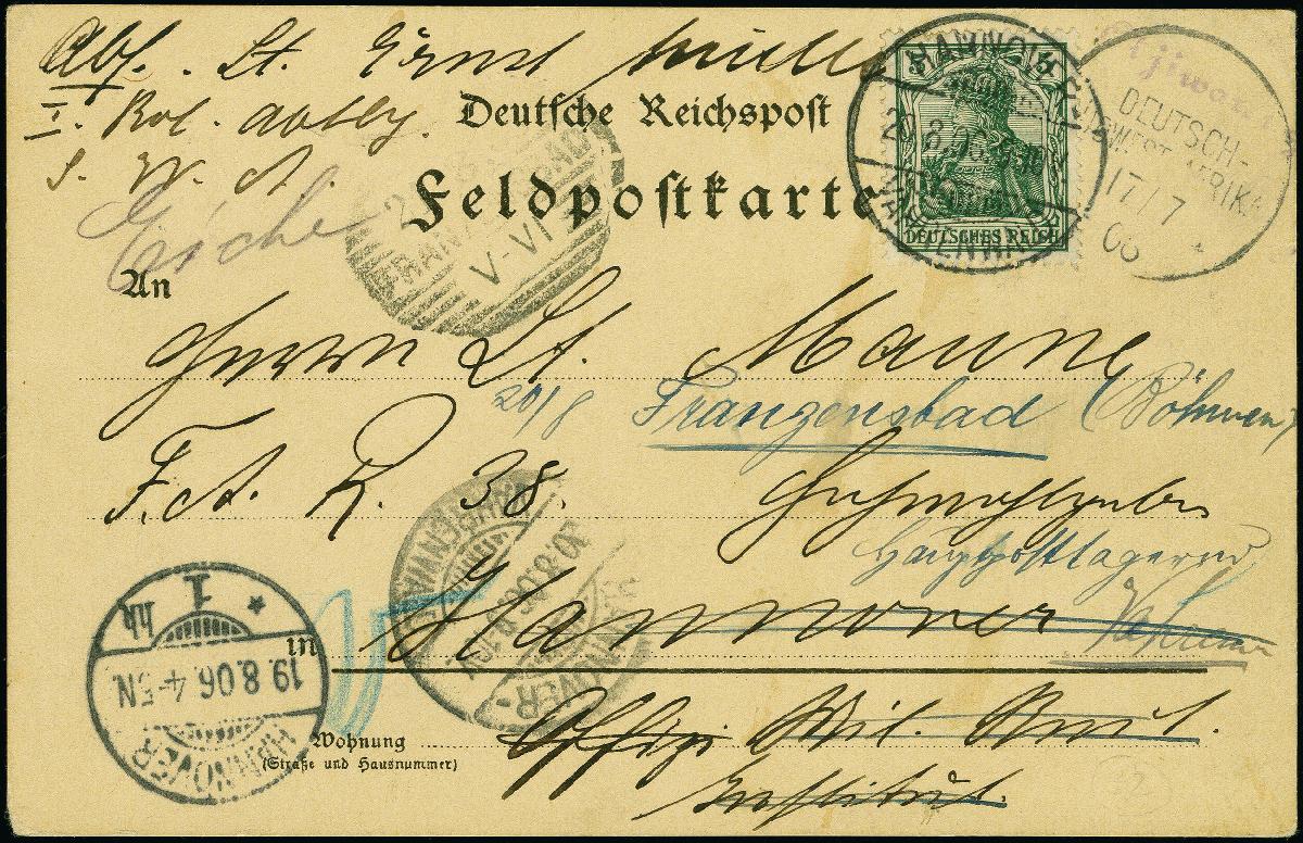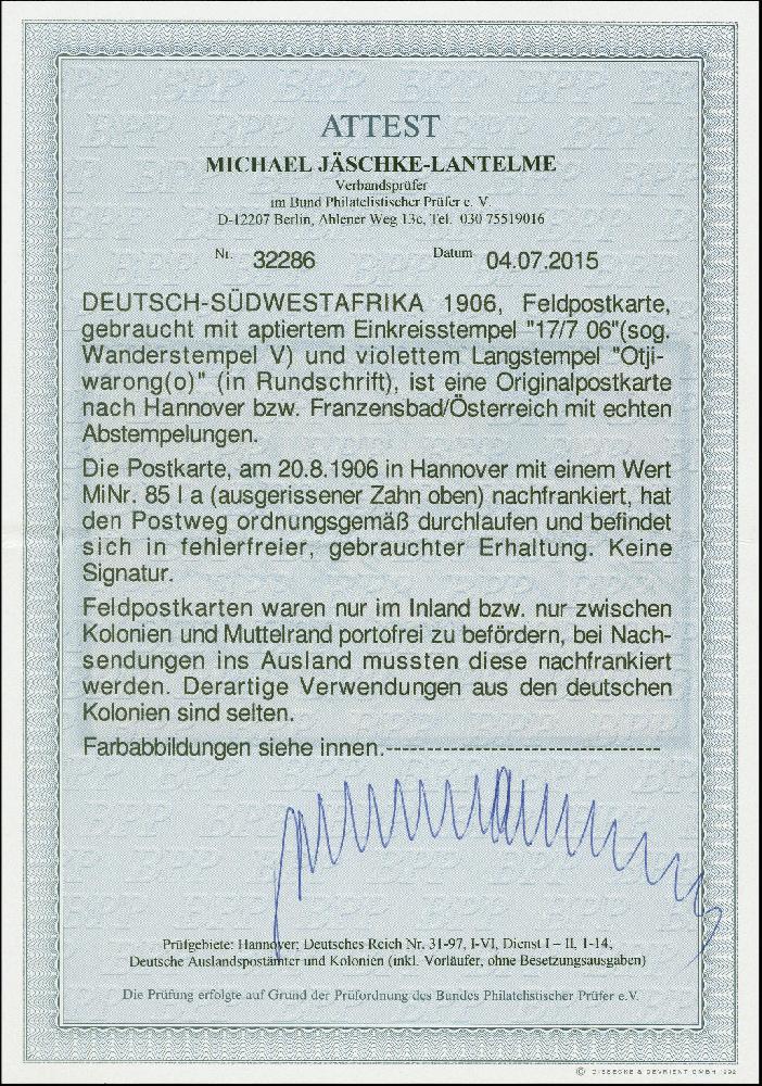 | Zusatzinformationen und Suchstichworte: | 383. Auktion Heinrich Köhler 14.–15. & 18.–23. März 2024 Los 7155 Deutsche Kolonien Südwestafrika "Otjiwarongo" violetter Rundschrift-Stempel und Wanderstempel vom "17.7.06" auf Feldpostkarte nach Hannover mit Ankunftsstempel und Nachsendung mit Germania 5 Pfennig mit Stempel "HANNOVER-VAHRENWALD 20.8.06" im Wechselverkehr mit Österreich nach Franzensbad mit Ankunftsstempel. Die Marke mit ausgerissenem Zahn oben, sonst in guter Gesamterhaltung, interessante Nachsendekarte mit Fotoattest Jäschke-L. BPP (2015) Ausruf 100,00 EUR |