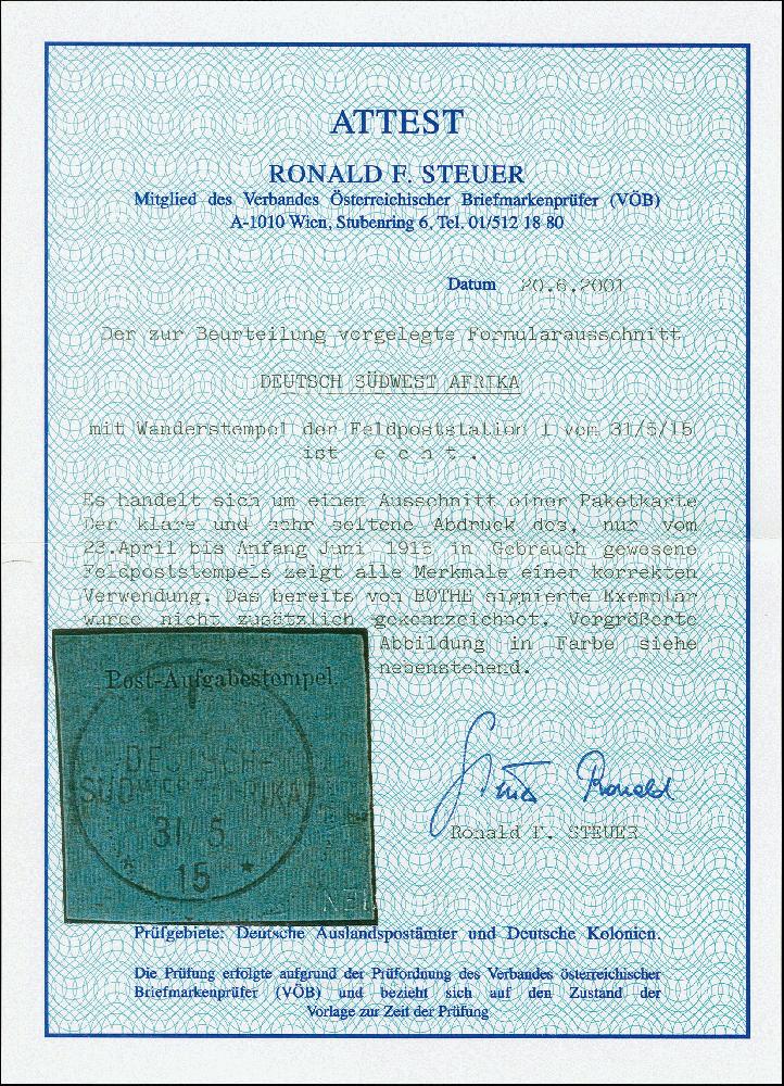 | Zusatzinformationen und Suchstichworte: | 383. Auktion Heinrich Köhler 14.–15. & 18.–23. März 2024 Los 7159 Deutsche Kolonien Südwestafrika "I DSWA 31.5.15" Feldpost-Wanderstempel ohne Gummistempel klar auf Feldpost-Postanweisungs-Briefstück in einwandfreier Erhaltung, signiert Bothe BPP und Fotoattest R. Steuer VÖB (2001) Ausruf 100,00 EUR |