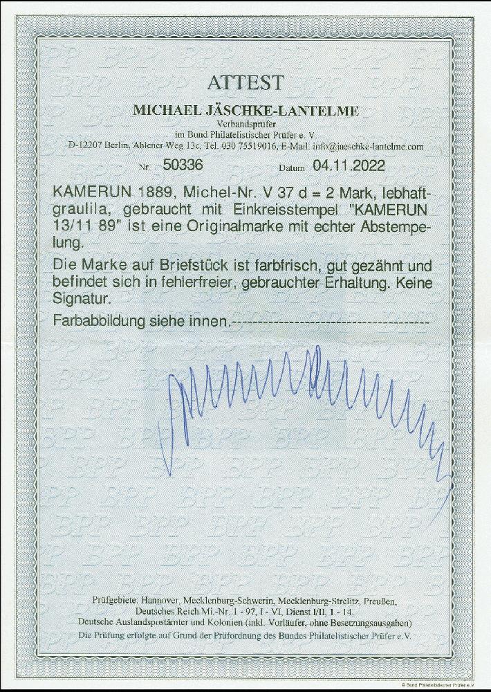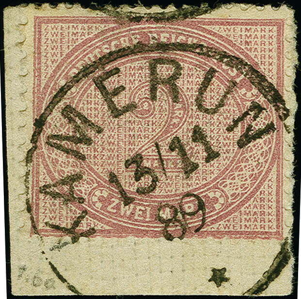 | Zusatzinformationen und Suchstichworte: | 383. Auktion Heinrich Köhler 14.–15. & 18.–23. März 2024 Los 7160 Deutsche Kolonien Kamerun, Vorläufer 1889, 2 Mark lebhaftgraulila mit klarem Stempel "KAMERUN 13.11.89" auf Briefstück in einwandfreier Erhaltung, Fotoatteste Dr. F. Steuer BPP (1994) und Jäschke-L. BPP (2022) Ausruf 150,00 EUR |