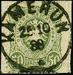 | Zusatzinformationen und Suchstichworte: | 383. Auktion Heinrich Köhler 14.–15. & 18.–23. März 2024 Los 7161 Deutsche Kolonien Kamerun, Vorläufer 1887, 50 Pfennig lebhaftolivgrün mit klarem Stempel "KAMERUN 25.10.88" auf Briefstück, Marke mit leichten Eckfehler rechts unten, sonst in guter Gesamterhaltung, ein schönes Exemplar dieser seltenen Farbe, Fotoattest Jäschke-L. BPP (2022) Ausruf 300,00 EUR |