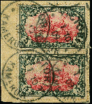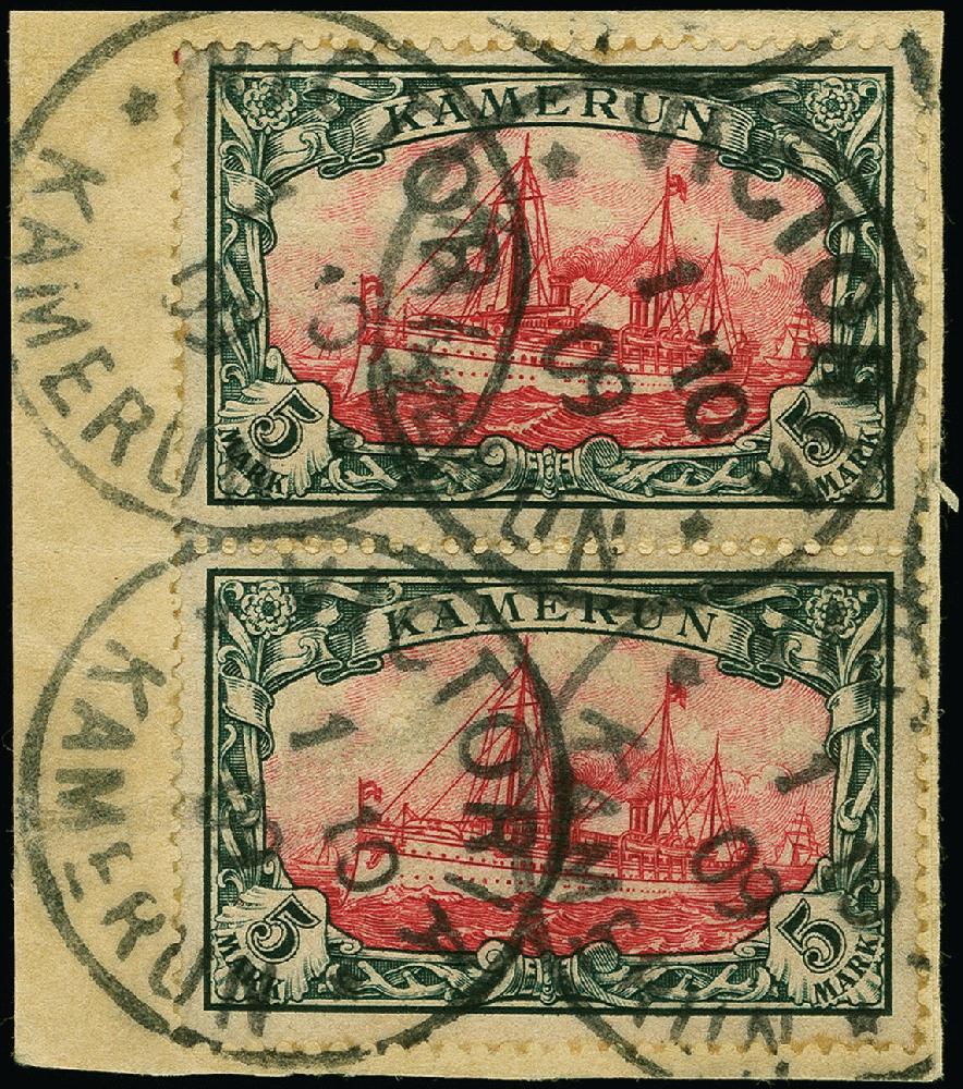 | Zusatzinformationen und Suchstichworte: | 383. Auktion Heinrich Köhler 14.–15. & 18.–23. März 2024 Los 7164 Deutsche Kolonien Kamerun 1900, Kaiseryacht 5 Mark ohne Wasserzeichen im senkrechten Paar mit Stempel "VICTORIA KAMERUN 1.10.09" auf Briefstück, leichte verwendungsbedingte Knitterspuren links, sonst einwandfrei, signiert GPSY und W. Engel und Fotoattest Jäschke-L. BPP (2022) Ausruf 200,00 EUR |