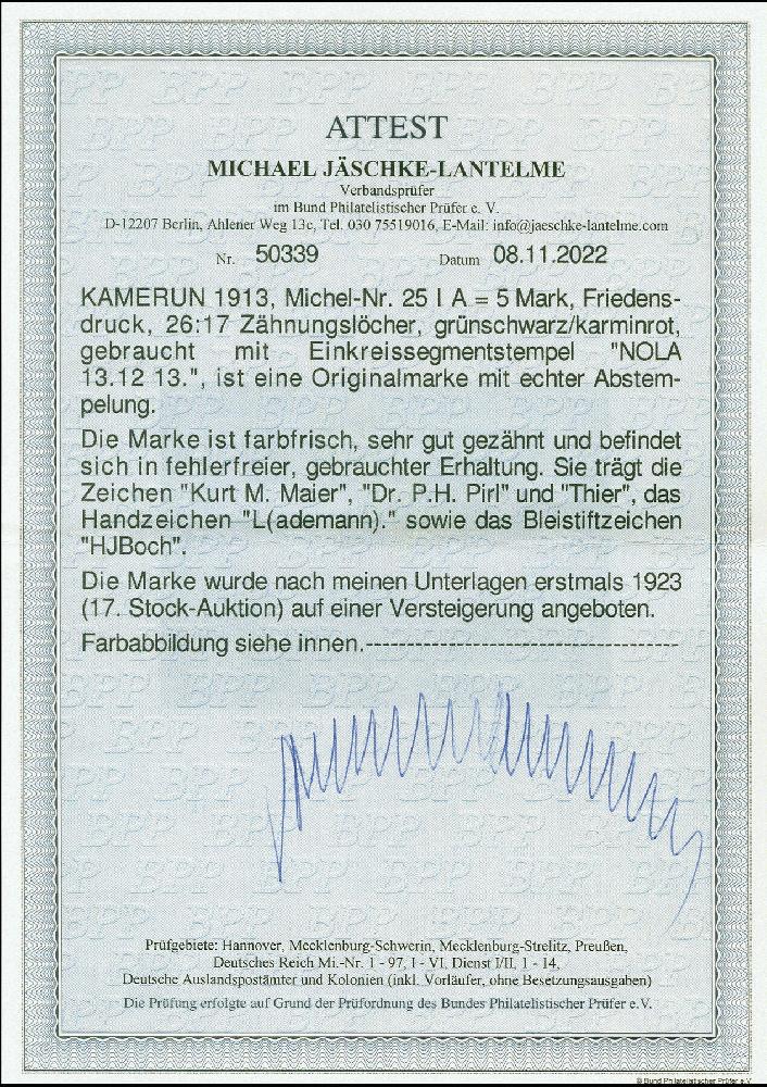 | Zusatzinformationen und Suchstichworte: | 383. Auktion Heinrich Köhler 14.–15. & 18.–23. März 2024 Los 7166 Deutsche Kolonien Kamerun 1900, Kaiseryacht 5 Mark mit Wasserzeichen, sauber mit Stempel "NOLA (KAMERUN) 13.12.13" in einwandfreier Erhaltung, sehr schönes Exemplar dieser immer sehr schwierigen Marke, mehrfach signiert mit u.a. Thier, Pirl und HJ BLoch mit Fotoattest (1956) sowie Fotoattest Jäschke-L. BPP (2022) Ausruf 800,00 EUR |