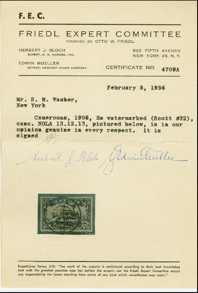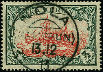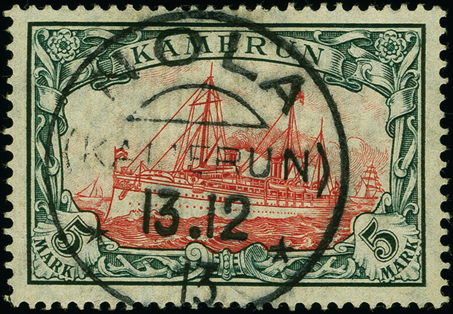 | Zusatzinformationen und Suchstichworte: | 383. Auktion Heinrich Köhler 14.–15. & 18.–23. März 2024 Los 7166 Deutsche Kolonien Kamerun 1900, Kaiseryacht 5 Mark mit Wasserzeichen, sauber mit Stempel "NOLA (KAMERUN) 13.12.13" in einwandfreier Erhaltung, sehr schönes Exemplar dieser immer sehr schwierigen Marke, mehrfach signiert mit u.a. Thier, Pirl und HJ BLoch mit Fotoattest (1956) sowie Fotoattest Jäschke-L. BPP (2022) Ausruf 800,00 EUR |