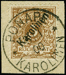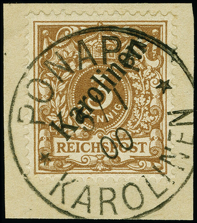 | Zusatzinformationen und Suchstichworte: | 383. Auktion Heinrich Köhler 14.–15. & 18.–23. März 2024 Los 7169 Deutsche Kolonien Karolinen 1899/1900, 3 Pfennig mit diagonalem Aufdruck, mit klarem Stempel "PONAPE 5.1.00" auf Briefstück in einwandfreier Erhaltung, signiert Dr. Lantelme BPP und Fotoattest Jäschke-L. BPP (2022) Ausruf 150,00 EUR |