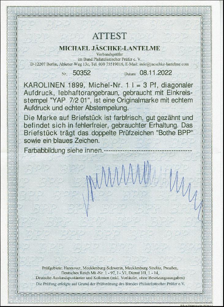 | Zusatzinformationen und Suchstichworte: | 383. Auktion Heinrich Köhler 14.–15. & 18.–23. März 2024 Los 7170 Deutsche Kolonien Karolinen 1899/1900, 3 Pfennig mit diagonalem Aufdruck, mit Stempel "YAP 7.2.01" auf Briefstück in einwandfreier Erhaltung, doppelt signiert Bothe BPP und Fotoattest Jäschke-L. BPP (2022) Ausruf 150,00 EUR |