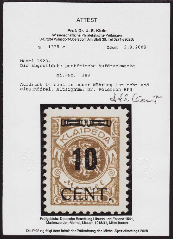 | Zusatzinformationen und Suchstichworte: | Christian E. Geigle Briefmarkenfachhandel Los 0003335207 Memel 1923, Freimarken mit Aufdruck, 10 C. auf 400 M. dunkelolivbraun, postfrisches Kabinettstück dieser seltenen Marke, farbfrisch und gut gezähnt, FA Prof. Klein "einwandfrei". Festpreis 550,00 EUR |