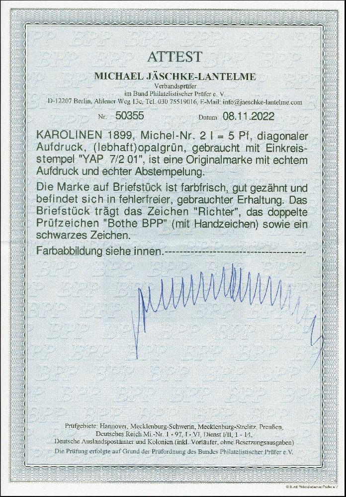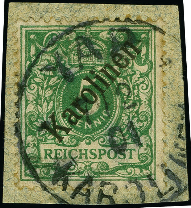 | Zusatzinformationen und Suchstichworte: | 383. Auktion Heinrich Köhler 14.–15. & 18.–23. März 2024 Los 7172 Deutsche Kolonien Karolinen 1899/1900, 5 Pfennig mit diagonalem Aufdruck, mit Stempel "YAP 7.2.01" auf Briefstück in einwandfreier Erhaltung, doppelt signiert Bothe BPP und Fotoattest Jäschke-L. BPP (2022) Ausruf 100,00 EUR |