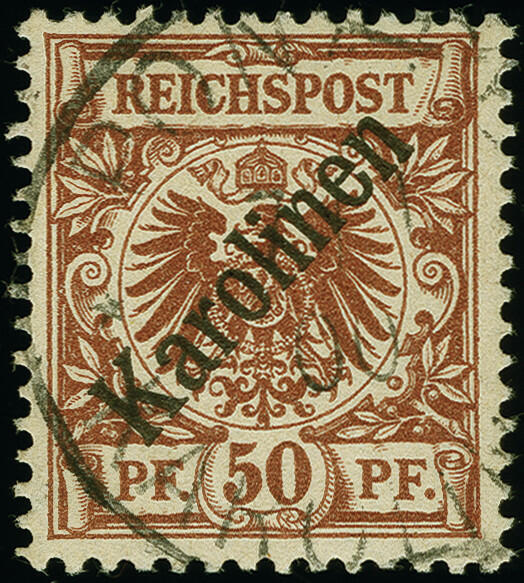 | Zusatzinformationen und Suchstichworte: | 383. Auktion Heinrich Köhler 14.–15. & 18.–23. März 2024 Los 7174 Deutsche Kolonien Karolinen 1899/1900, 50 Pfennig mit diagonalem Aufdruck, sauber mit Stempel "PONAPE 7.1.00" in einwandfreier Erhaltung, signiert Dr. Lantelme BPP und Fotoattest Jäschke-L. BPP (2022) Ausruf 300,00 EUR |