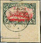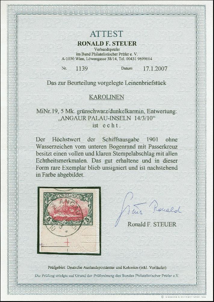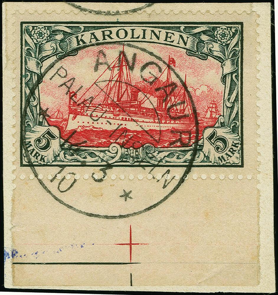 | Zusatzinformationen und Suchstichworte: | 383. Auktion Heinrich Köhler 14.–15. & 18.–23. März 2024 Los 7176 Deutsche Kolonien Karolinen 1900, Kaiseryacht 5 Mark ohne Wasserzeichen, Unterrandstück mit Passerkreuz, sauber mit Stempel "ANGAUER PALAU-INSELN 14.3.10" auf Briefstück in einwandfreier Erhaltung, Fotoattest R. Steuer BPP (2007) Ausruf 150,00 EUR |